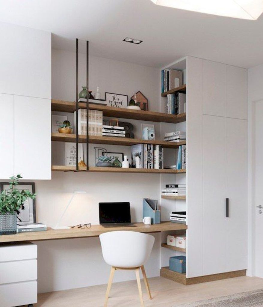 Основная идея для дизайна совмещенного рабочего уголка – это размещение открытых полок, которые уместны в любом направлении и стиле. Здесь лишь можно варьировать материалы и декор таковых. Например, в ультратехнологичной обстановке можно установить и металлические стеллажи, в других дизайнах это может быть и стекло, и древесина. Именно она используется чаще всего. Открытые полки удобны не только потому, что легко вписываются в разные интерьеры, но они и более эргономичны – сидя в кресле гораздо проще дотянуться до книги, учебника или папки, чем до дверцы, чтобы ее открыть и закрыть.