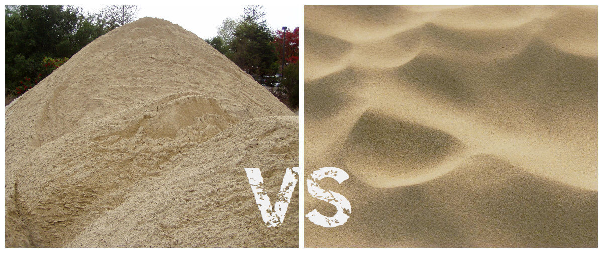 - Карьерный песок имеет острые, неровные грани. Это повышает его армирующие свойства. Но в карьерном грунте возможны примеси глины, которая снижает жесткость конечного окаменения.