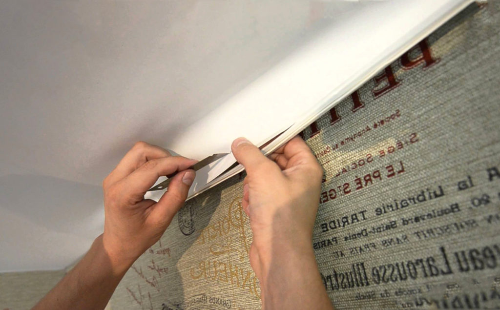 Многие специалисты вообще не берутся за демонтаж такого потолка, так как извлечь штапики, не повредив полотна, очень сложно. Приходится работать только на внешней стороне. Для этого необходимо взять оставшиеся после монтажа кусочки ткани, вырезать фрагмент узора, соответствующий испорченному, нанести клей и наложить на поверхность. Интенсивно придавливать и растирать ни в коем случае нельзя.