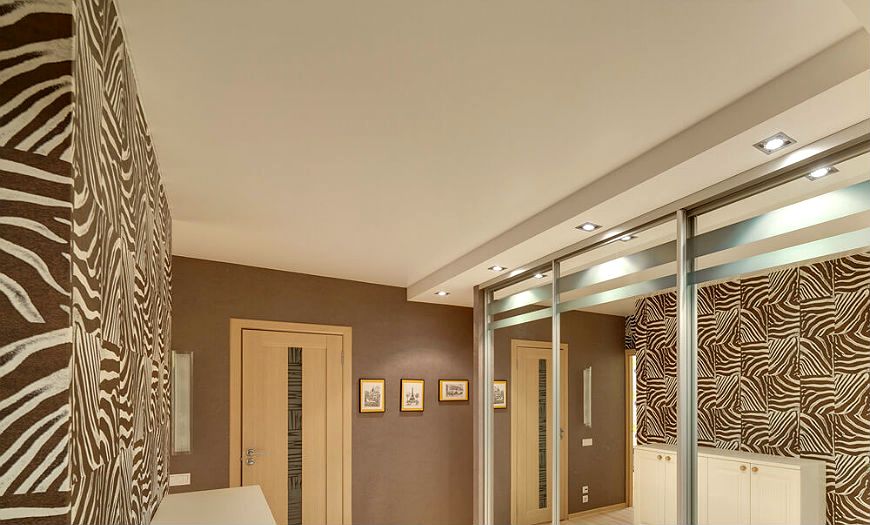 Полноразмерные зеркала в рост человека можно установить на свободной стене или фасадной части шкафа-купе. Деталь создаст ощущение углубления комнаты и визуально расширит ее. В качестве дополнительного акцента используют натяжные потолки с глянцевым покрытием.