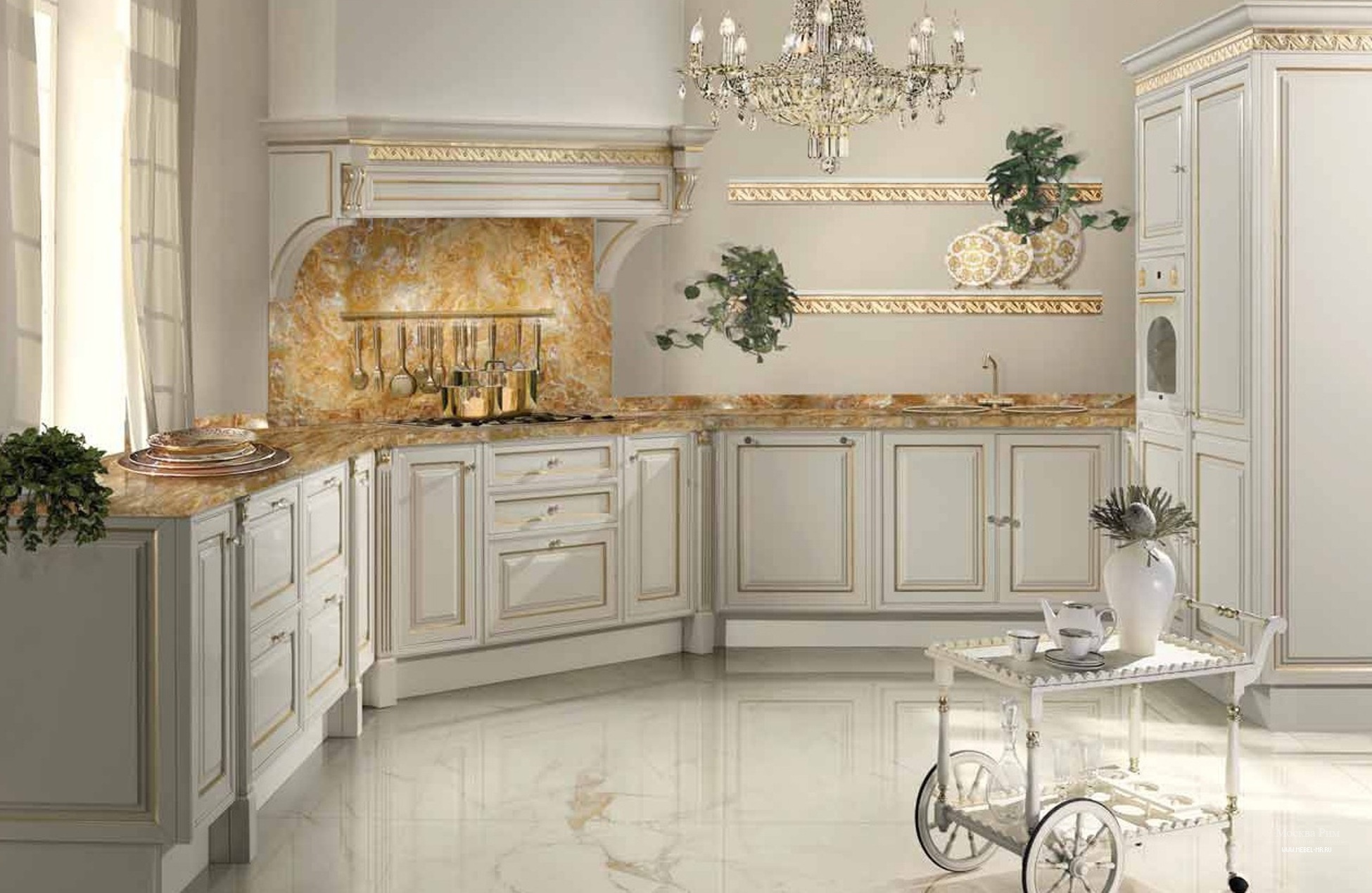 Потолок в представленном стиле желательно оставить белым. При желании его можно украсить позолоченной фреской или лепниной