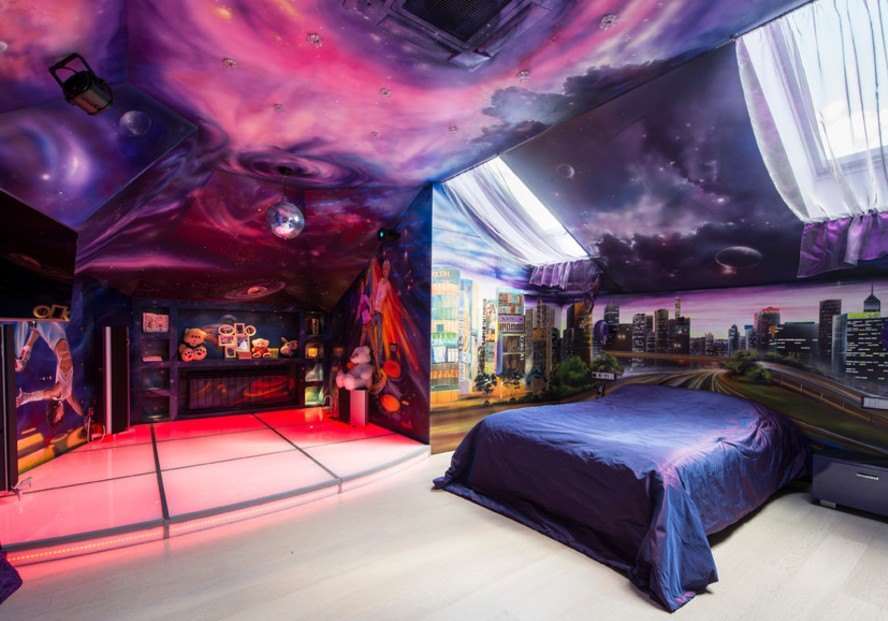 Несложно догадаться, что техника основана на использовании флуоресцентных красок, которые светятся в темноте. Уникальное изображение можно создавать при помощи различных цветовых решений этих специальных красок. Но наибольшее распространение техника получила для оформления потолка в виде звездного неба. Помимо сказочного эффекта, создается ощущение безразмерности пространства.