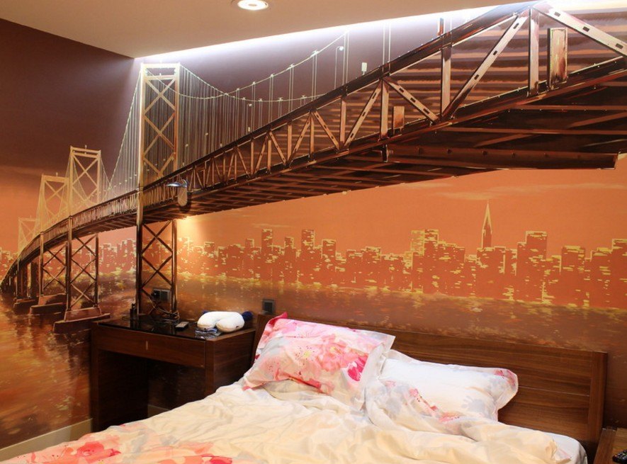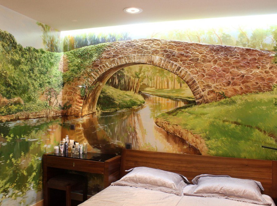 С помощью объемной роспись можно визуально стереть границы помещения, сделать потолок «выше», а комнату «шире». Безусловно, на конструктивные особенности помещения роспись не влияет, но зрительно создается эффект некоторого искривления объемов пространства. Дизайнерам нравится изображать лестницы, уходящие вдаль и будто бы не имеющие конца или распахнутые окна, за которыми открывается красивый пейзаж.
