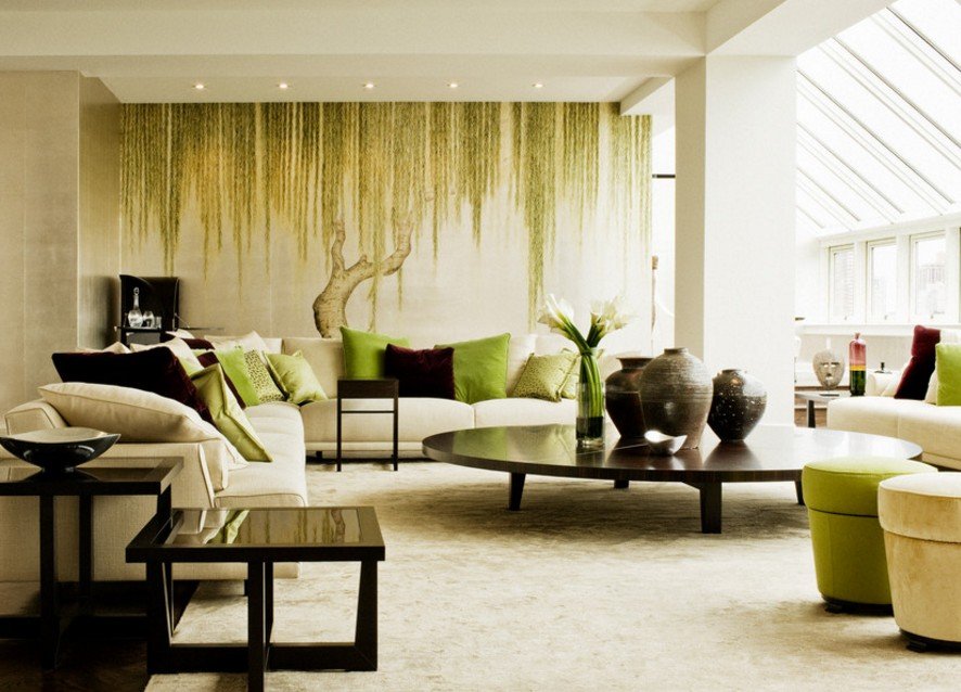 - Стиль модерн . Его легко узнать по растущим, живым и дышащим абстрактным формам. Характерной чертой стиля является сложная система орнамента с крупными цветами и изогнутыми волнистыми стеблями. Иногда в модерне изображаются и сказочные существа: русалки, эльфы, а также диковинные растения, образующие характерные изогнутые линии. В цветовой гамме стиля преобладают природные оттенки. Все в модерне стремится к рационализации и упрощению, но без ущерба изяществу. Интерьер в этом стиле не отличается излишествами и проявлениями статуса, но подразумевает ненавязчивое присутствие природы. Для модерна характерно гармоничное сочетание функциональности и декора.