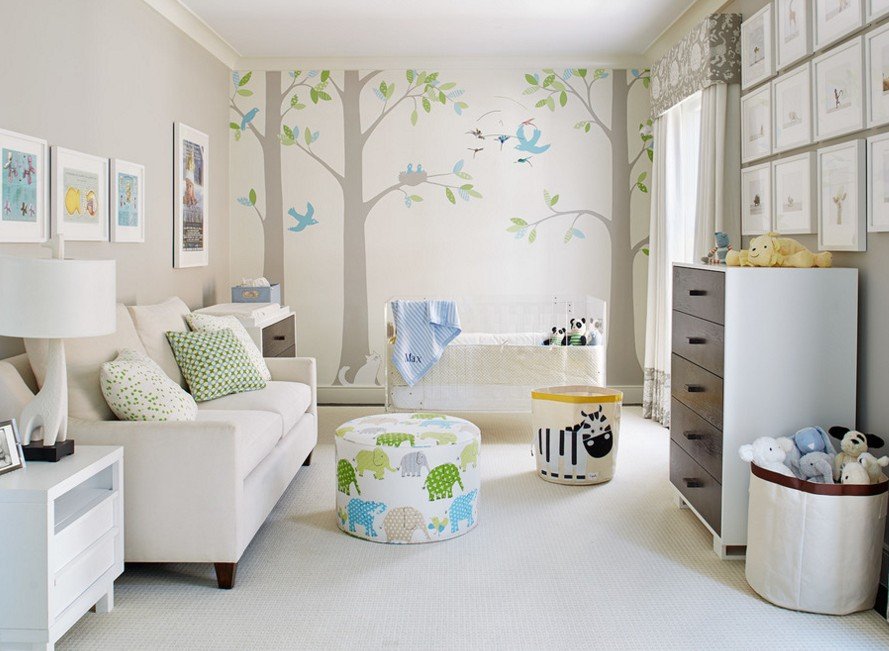 На стенах в комнате изображают загадочный лес, героев из мультфильмов и сказок. Именно поэтому для декора нужно выбирать светло-голубые, розовые, светло-зеленые или персиковые тона.