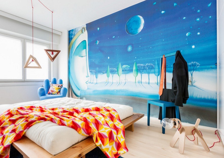 Вчерашние дети имеют совершенно другие интересы и предпочтения. Мультяшные герои и принцессы для подростков совершенно неактуальны. Они уже детально представляют – как должна выглядеть их комната. Поэтому стоит доверить им выбор изображения, сюжета и оттенков. Одни ребята не желают присутствия в комнате броских изображений, которые могут мешать им сосредоточиться на уроках, и выбирают нейтральные тона. Другие предпочитают яркие эффектные элементы, которые помогают взбодриться и соответствуют их увлечениям. Это могут быть простые геометрические фигуры, изображения футбольной тематики, автомобили, мотоциклы, различные надписи на черном фоне, изображения рок-звезд и музыкальных инструментов – гитары, барабанные установки, комиксы, граффити. Романтические особы, несомненно, оценят лесные и городские пейзажи, цветочные орнаменты, звездное небо.