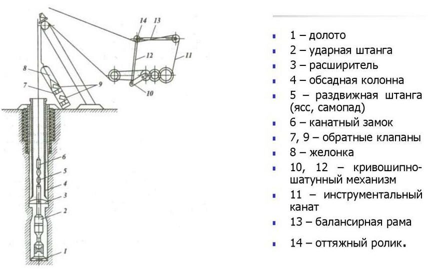 Ударно-канатный способ является самым трудоемким. Но его не стоит забывать, так как он самый качественный. Порода разрушается после удара тяжелого предмета. Это особой формы заостренный стакан из стальной трубы. Он падает с высоты, ударяется о почву, забирает разрушенный грунт и поднимается. Наверху стакан чистят и снова бросают вниз.