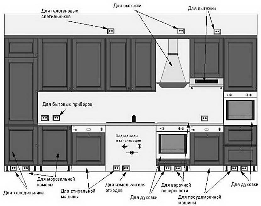 Чтобы в процессе эксплуатации кухни не возникало аварийных ситуаций, необходимо заранее просчитать мощность электропроводки