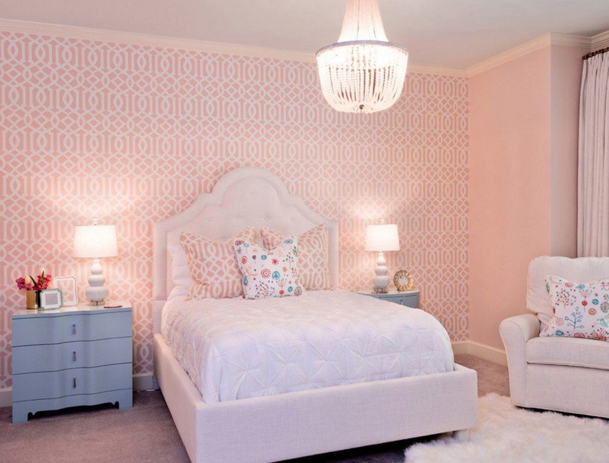 Меблировку при таком сочетании нужно выбирать в разной гамме. Например, кровать может быть белой, а тумбочки — розовыми.