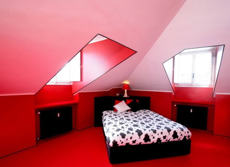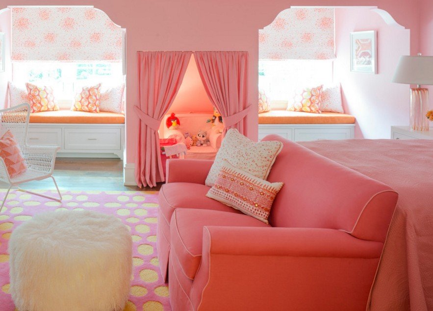 Неповторимость данной комбинации состоит в том, что здесь не важно, какой цвет главный, а какой – второстепенный. Розовые стены в спальне, лазурные покрывала и шторы гармонично дополняют друг друга
