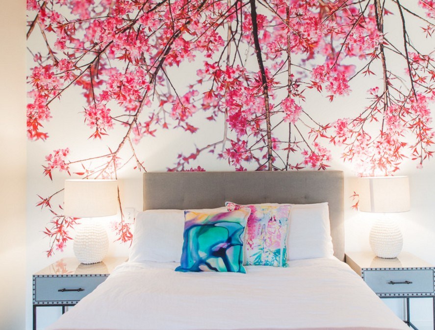 Это сделает дизайн неповторимым. В комнате с нейтральной цветовой палитрой допустимо применение разноцветных обоев с привлекательным узором, имитирующим облетающие лепестки.