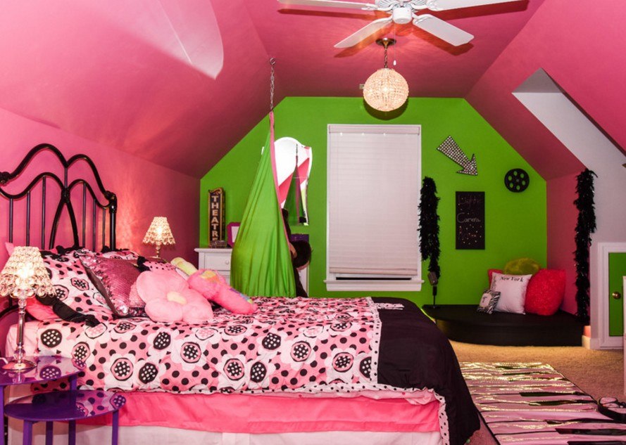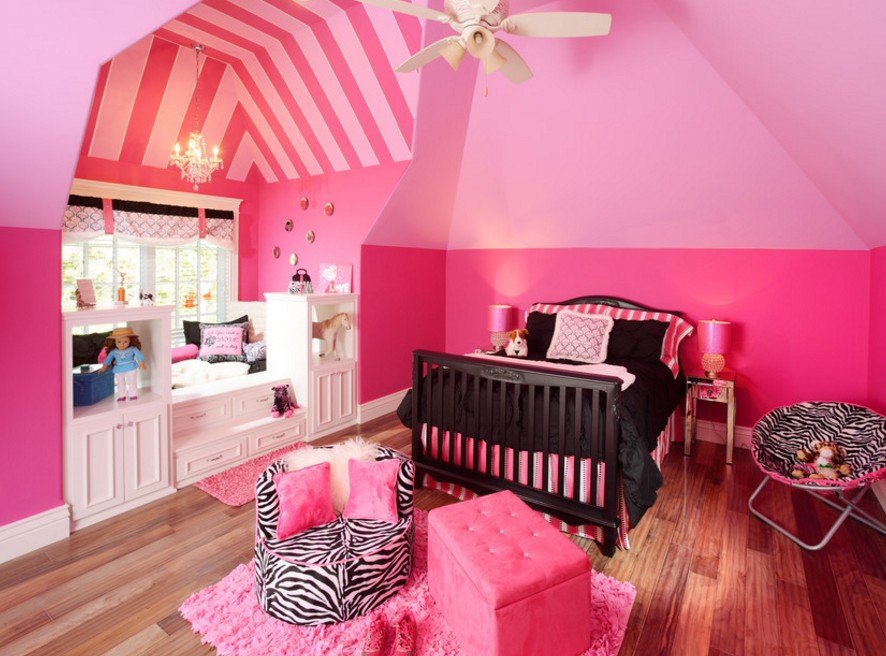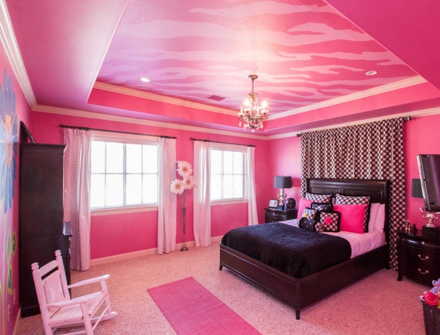 На фото яркая детская комната, потолок которой отделан темно-розовым оттенком. Интерьер дополняют другие детали похожих оттенков.
