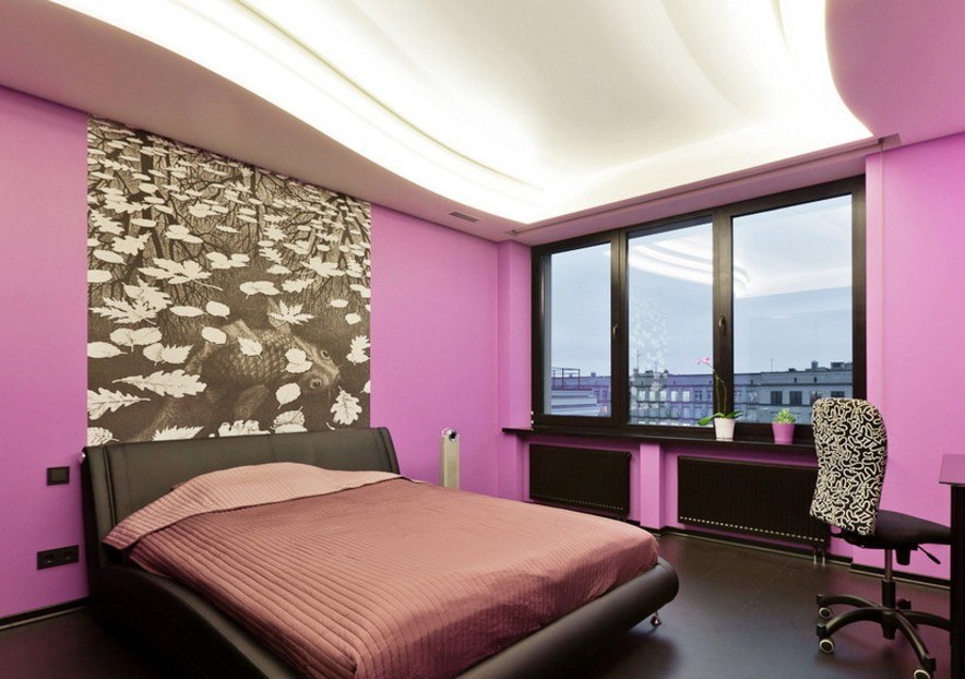 Белый, как известно, увеличивает помещение, а белый потолок сделает его выше. Комбинирование розового с этим цветом заполнит помещение комфортом и чистотой.