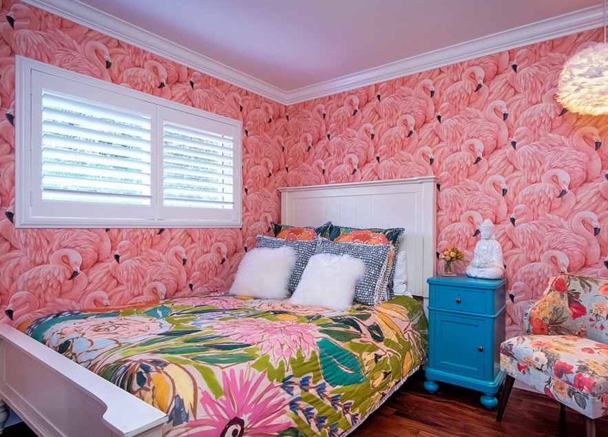 В зависимости от выбранного стиля, розовый цвет может преобладать в рисунках, принтах. Окончательный выбор будет зависеть от приоритетов владельцев спальной комнаты. Стены можно будет сделать акцентными деталями или, наоборот, немного приглушить в общем формате. Для стилей кантри или прованс обои могут быть однотонными – нежно-розового цвета или более насыщенных оттенков.