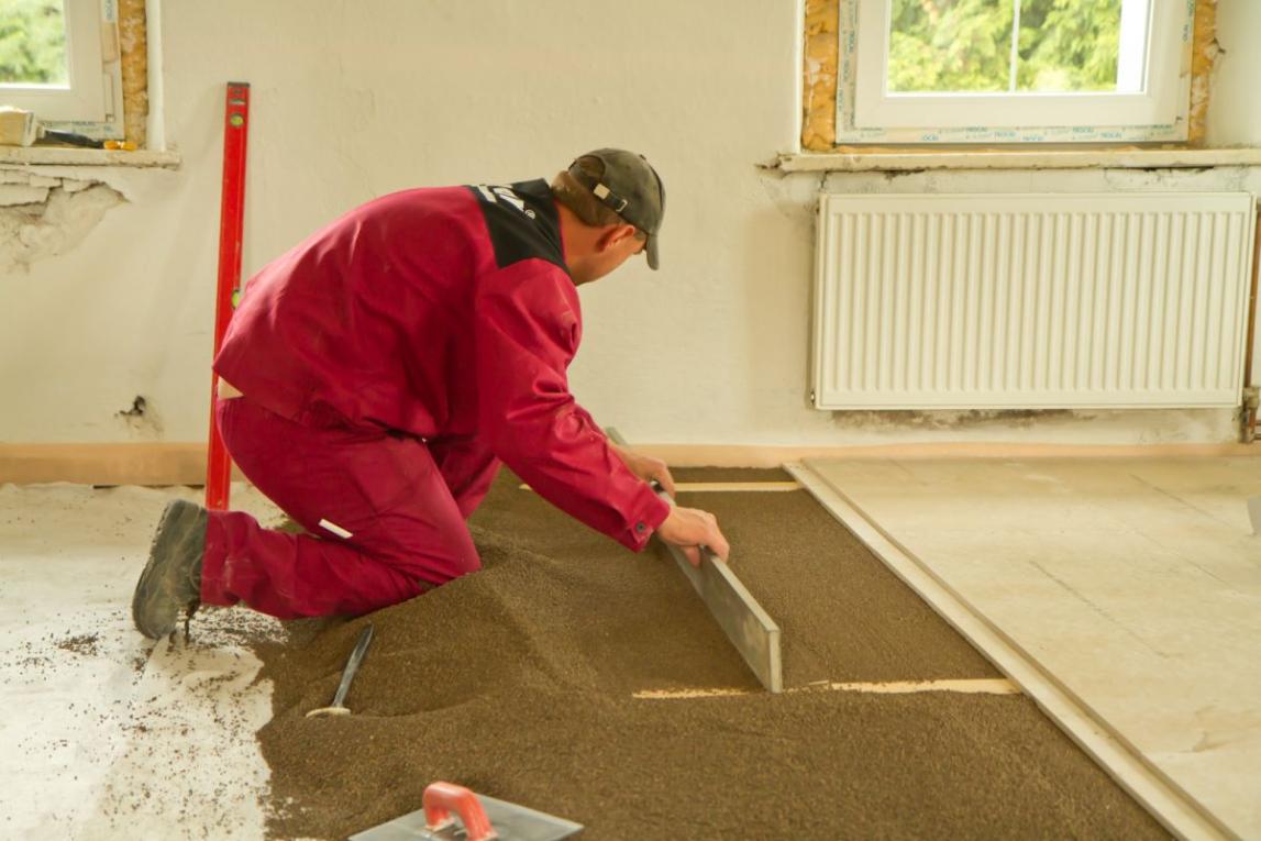 Стяжка пола. Для этой операции используют цементно-песчаные смеси. Для придания стяжке прочности песок и цемент смешивают в равных долях.
