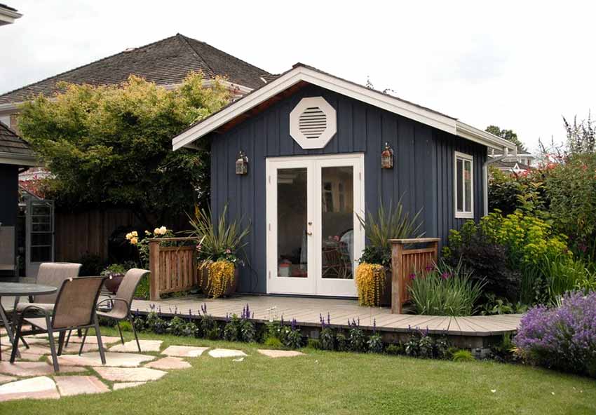 - за жилым домом, чтобы его не было видно. Иногда сарай также маскируют с помощью вертикального озеленения;