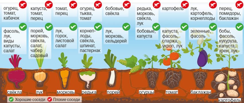 | Спорные мнения о совместимости | Томат, баклажан, болгарский перец, кабачки, чеснок, салат, редис, редька. |