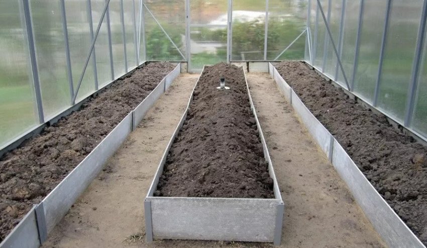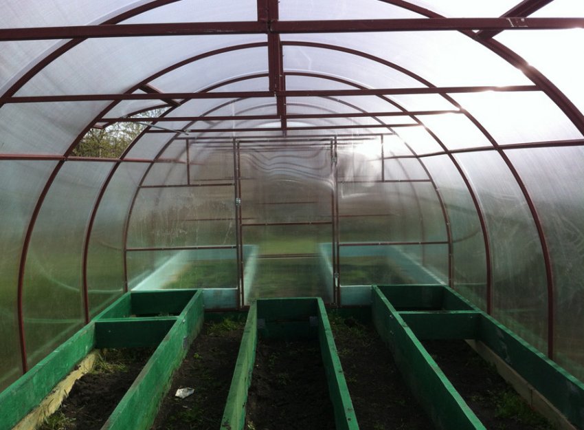 Если в тепличном сооружении 3 грядки, то распределить их можно следующим образом: по центру расположить огурцы, на боковых грядках — перцы, синие, капусту, между грядками — зелень