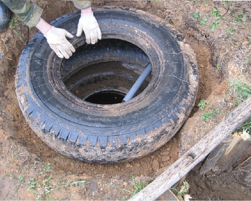 В третьей-четвертой покрышке необходимо проделать отверстие для сточной трубы, идущей из частного дома. Стык вокруг пластика укрепляется либо эпоксидной смолой, либо жидким битумом. Некоторые строители советуют делать самый верхний ярус колодца из широкой покрышки от Камаза. Это позволяет проводить ревизию колодца без лишних осложнений.