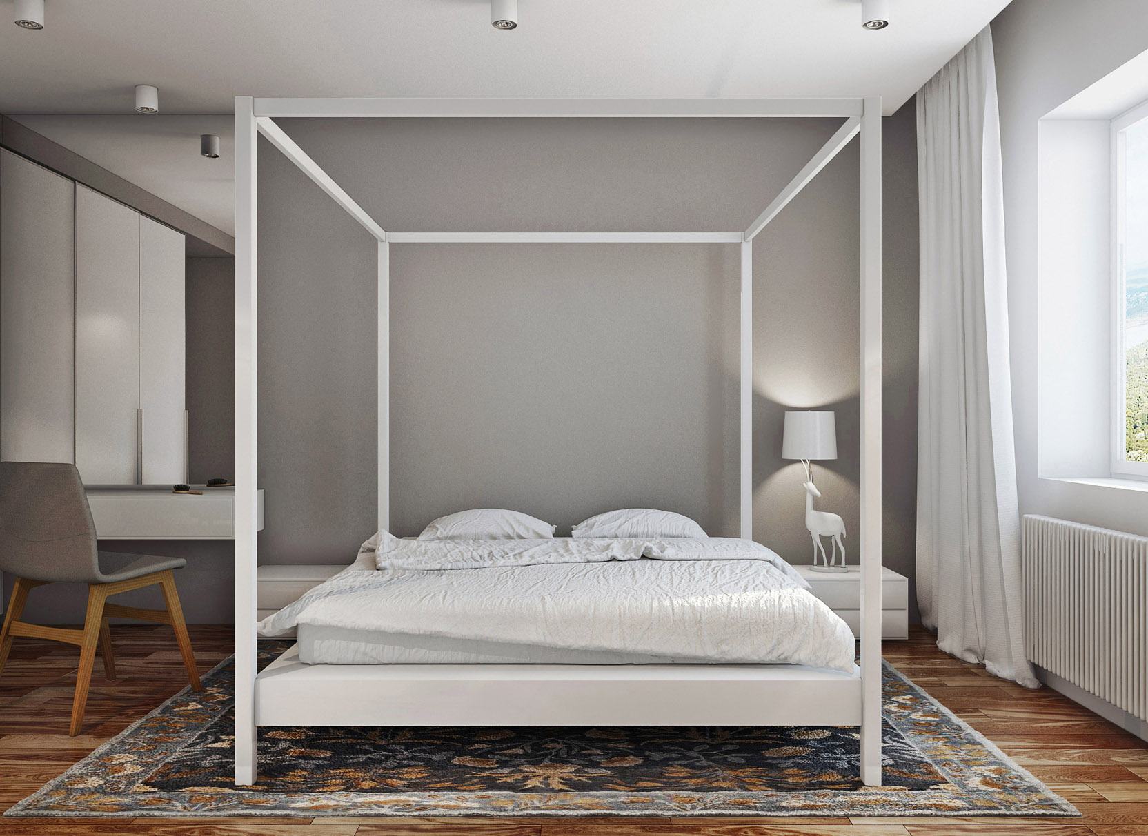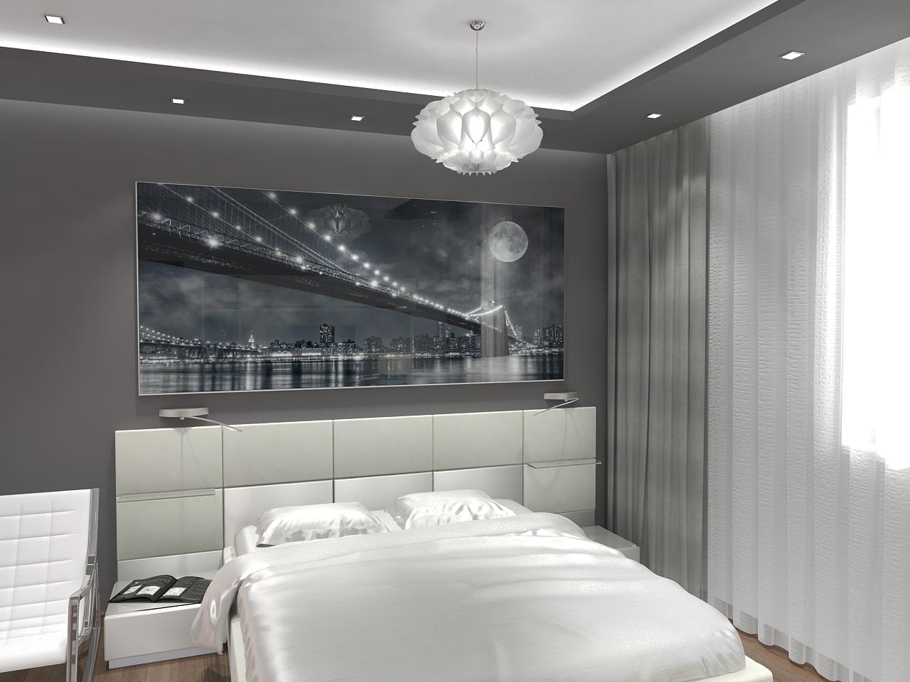 Спальня оформляется как серый монохром, а затем разбавляется при помощи различных текстур и мебели.