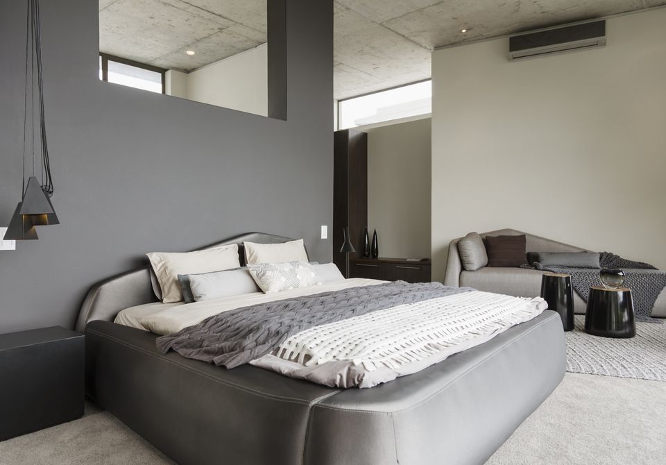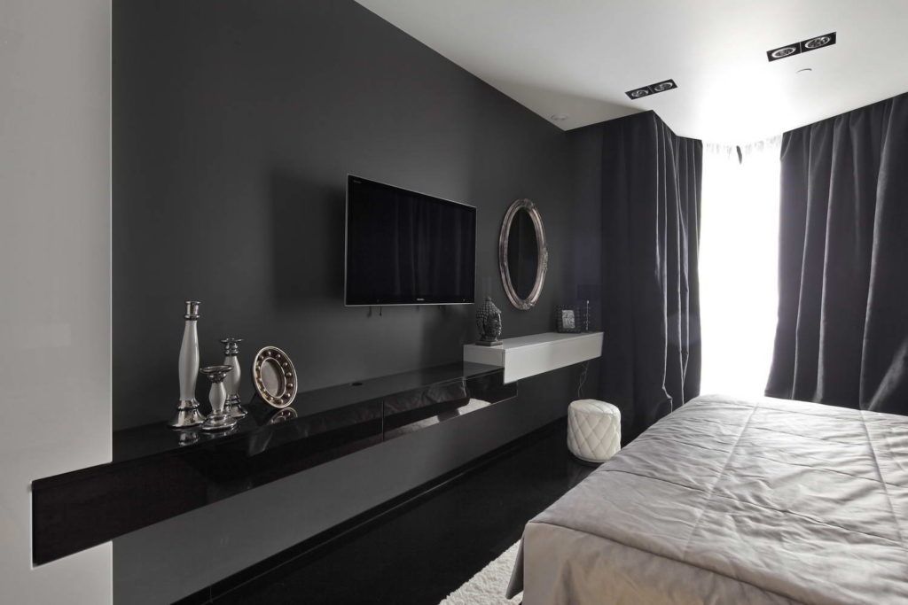 Графитовый и различные другие отенки тёмно-серого цвета в спальне в стиле хай-тек
