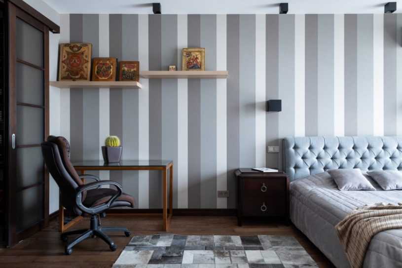 Фотообои с изображением растений или геометрических фигур станет уместным вкраплением в серую спальню. Дополнительной ссылкой на монохромность комнаты являются также подушки на кровати. Широкие серо-графитовые полосы на стене также станут отличным выбором для современного интерьера. Выдержанные в одинаковых цветах они придают интерьеру характер.