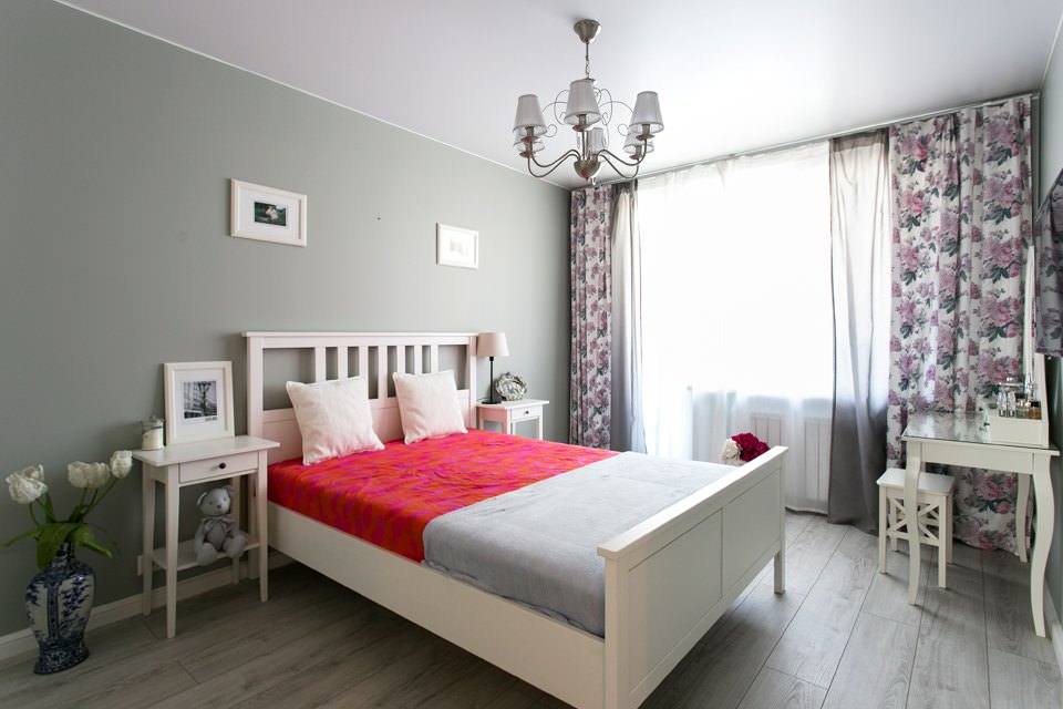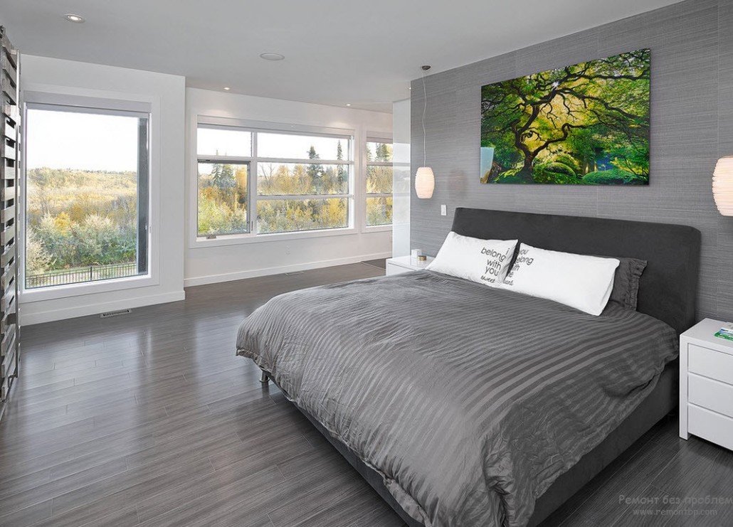 Также часто встречающейся идеей оказывается серый ламинат. Серая спальня с серым полом визуально формирует целостное помещение, в котором отсутствуют переходы.