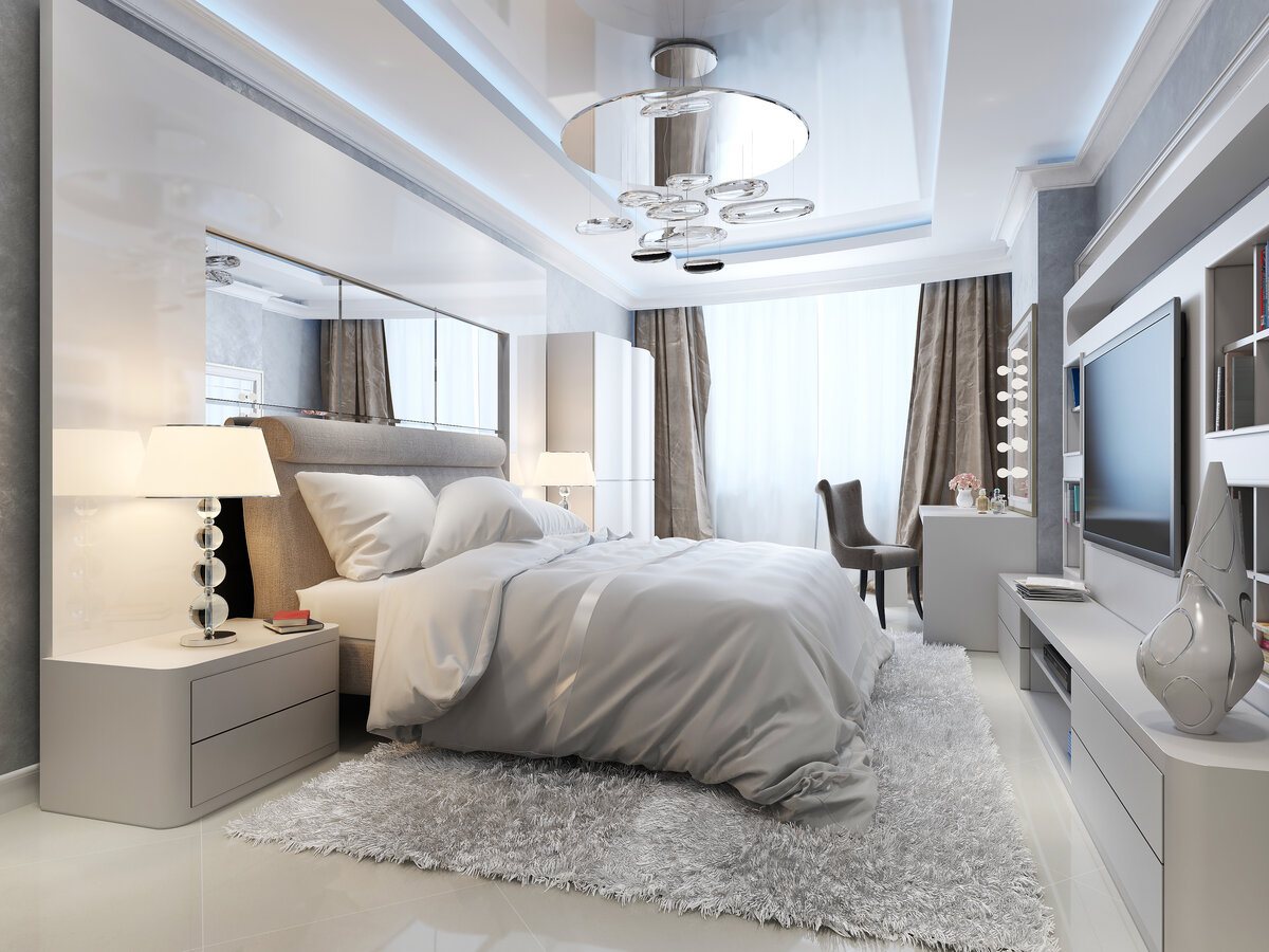 Подходящим вариантом для серой спальни станет выбор глянцевой поверхности, на которой будет заметен отражающий эффект.