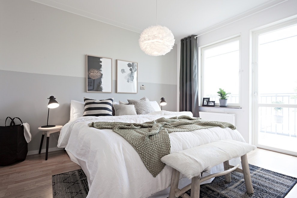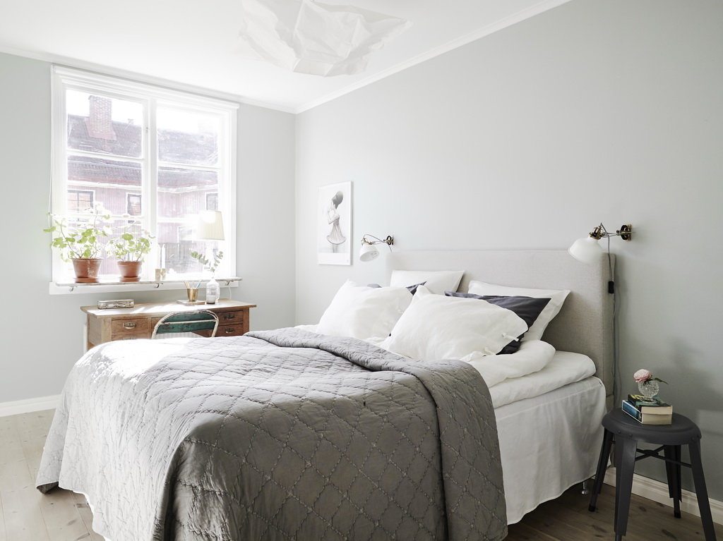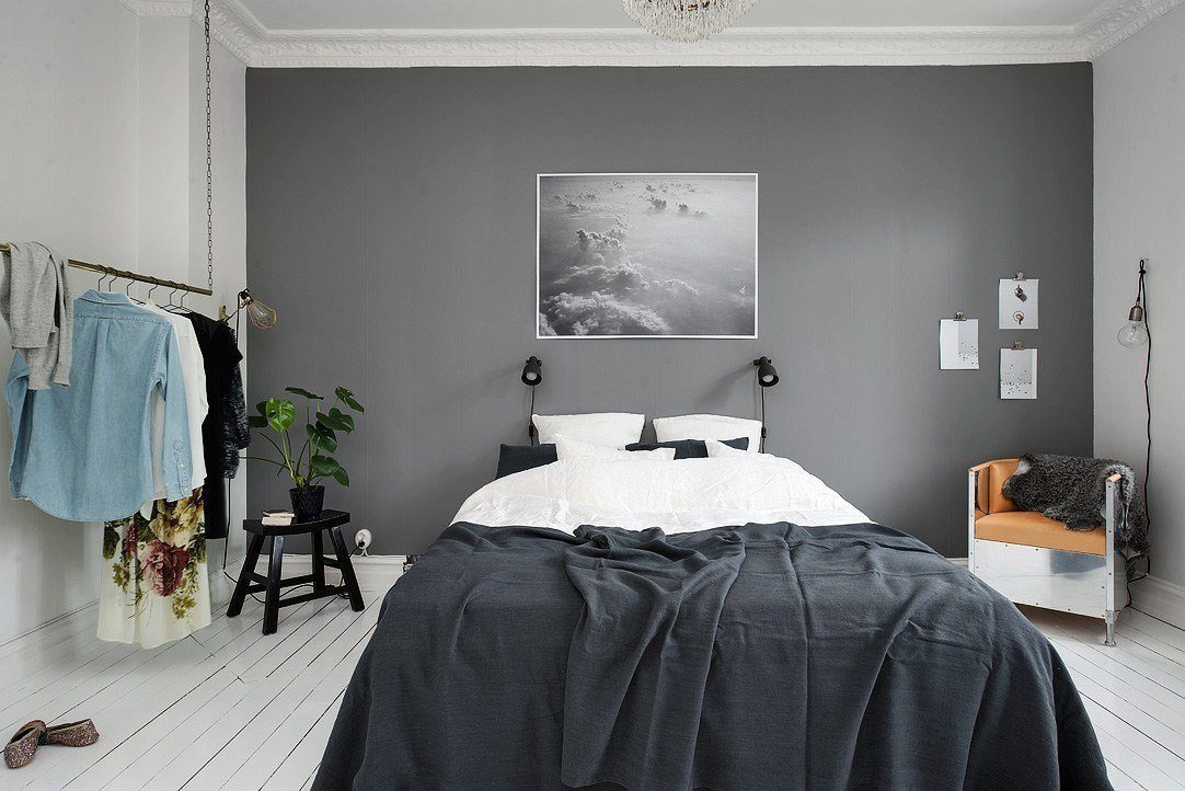 Для скандинавских интерьеров серый цвет обычно выступает базой при оформлении стен. Однако он крайне редко становится монохромом в спальне.