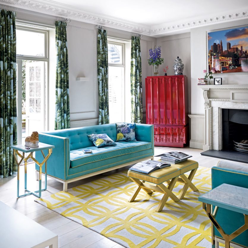 Еще одно необычное решение — голубой в гостиной в сочетании с фиолетовым или зеленым. Сначала может показаться, что цвета не совпадают. Однако, ища вдохновения, вы обнаружите, что это неправда. Поверьте, это отличное и оригинальное сочетание. Фиолетовый зал можно обустроить голубыми аксессуарами в виде декоративных бутылочек, подушек и рисунка. Голубой в сочетании с зеленью также отлично смотрится.