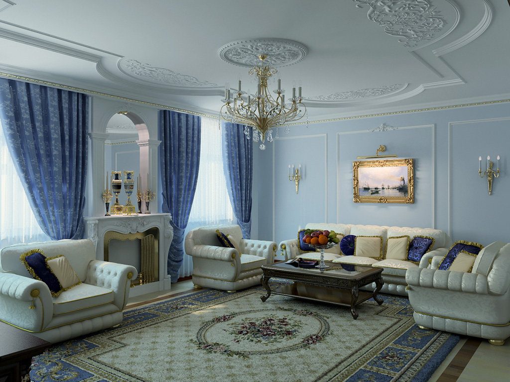 Классика. Стиль для ценителей роскоши, и здесь голубой должен использоваться вместе с бежевым, молочным или золотистым. На стенах просторных комнат вешают светлые полотна с оригинальным узором, а также используют молдинги и лепнину.