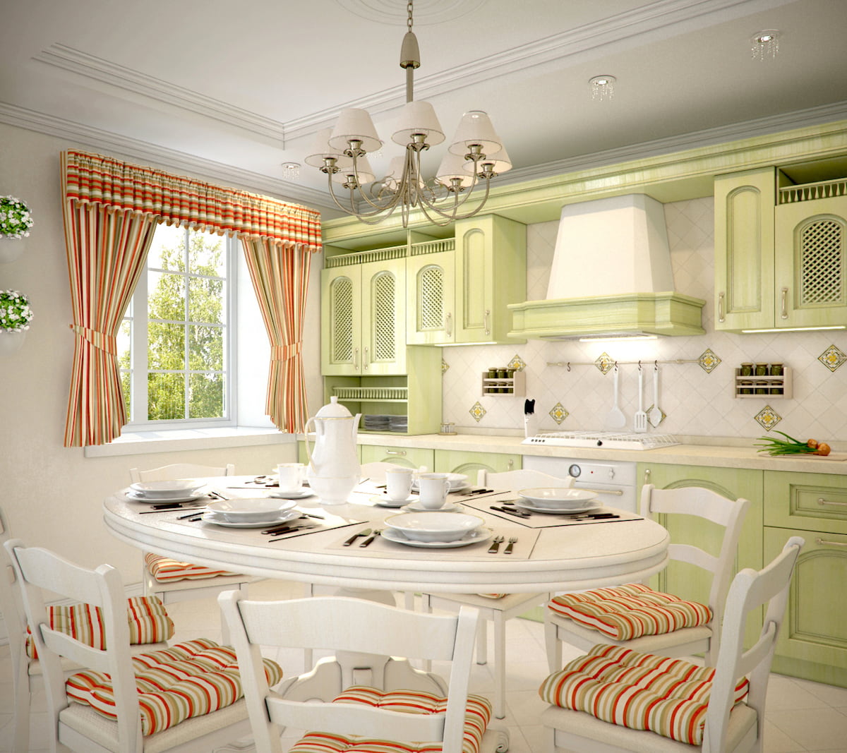 Романтичный французский стиль прованс предпочитает легкие воздушные ткани в нежных оттенках. В основном используется мелкий рисунок в цветочек.