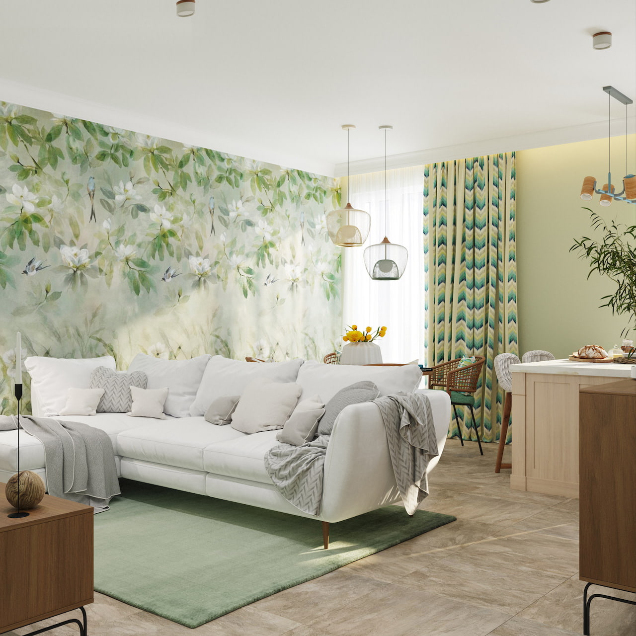 При использовании холодного цвета на обоях применяют шторки светлого или темного прохладного зеленого оттенка. А при использовании теплых тонов можно смело применять оливковые и салатовые вариации.