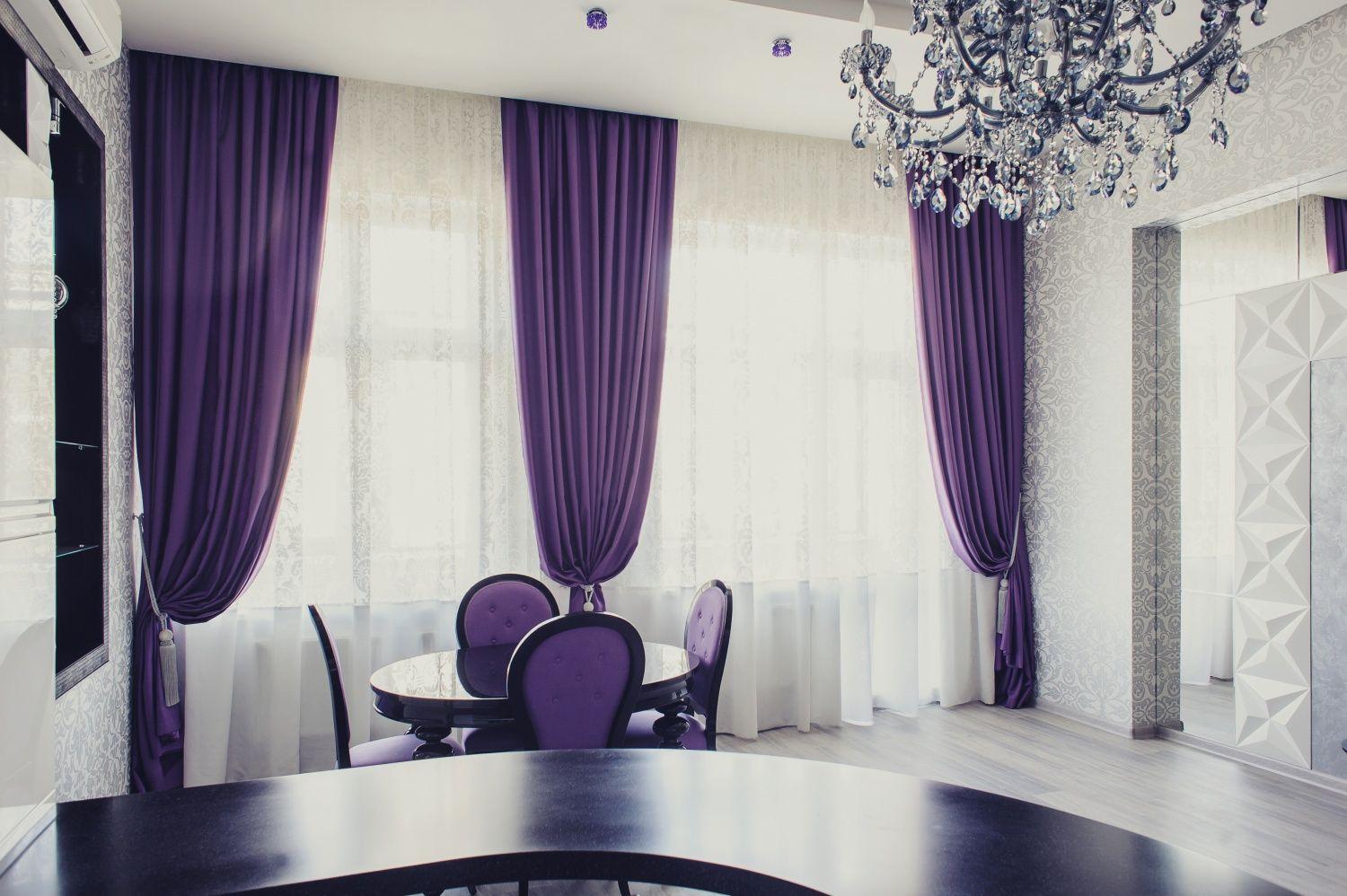 К фиолетовым обоям с узорами или растительным орнаментом подойдут фиолетовые однотонные занавески. И, наоборот, если обои без рисунка, то, чтобы избежать блеклости, можно выбрать портьеры в тон, но со сложной текстурой. Это могут быть узоры, ламбрекены или канты.