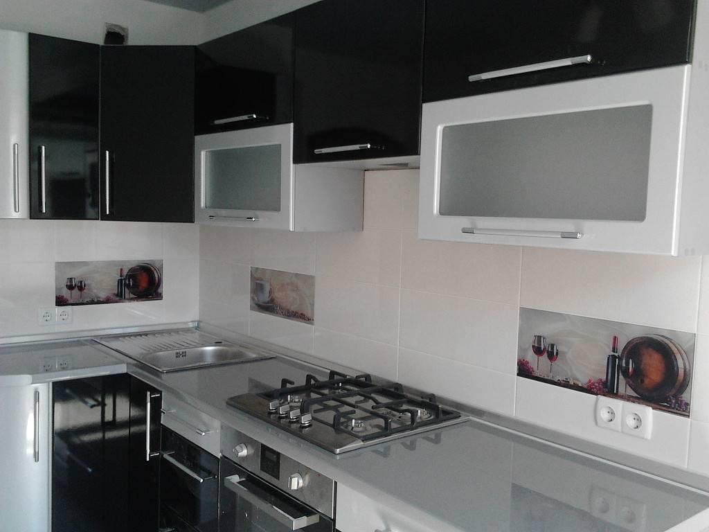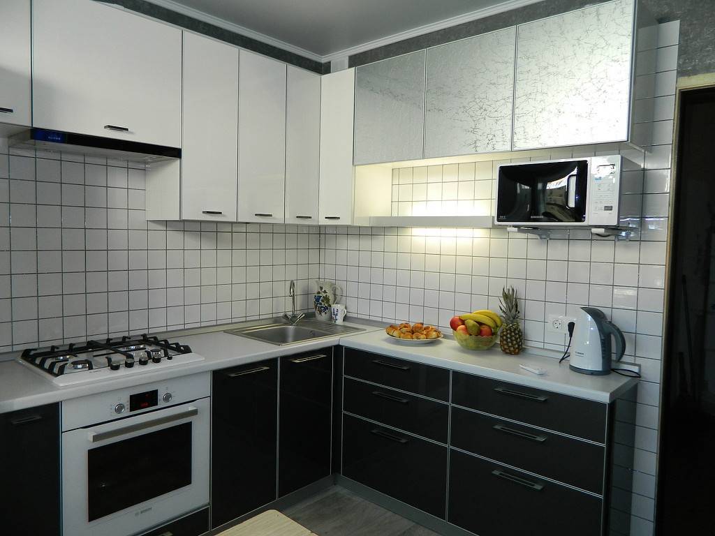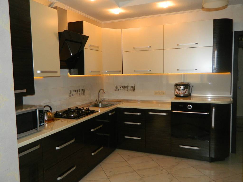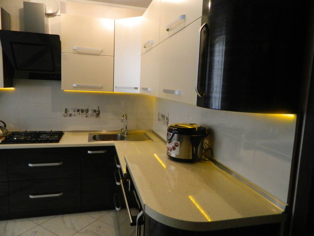 - черным. Создает необычно эффектный контраст. Более темный оттенок рекомендован для отделки различных мелких элементов. Допускается и использование столешницы черного цвета.