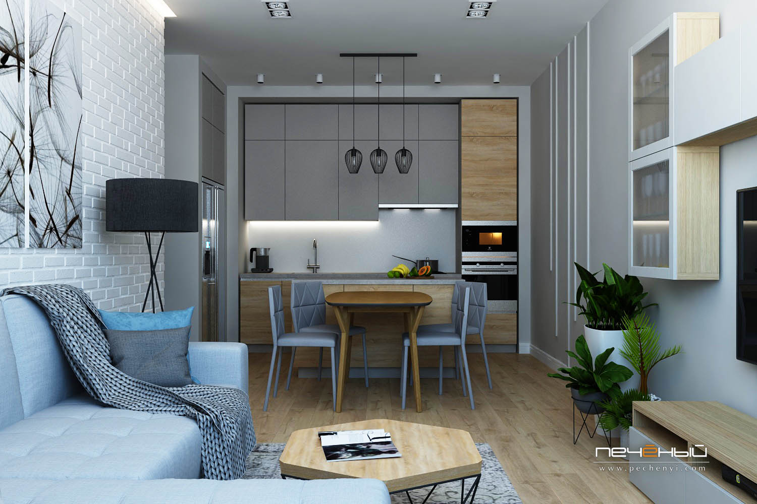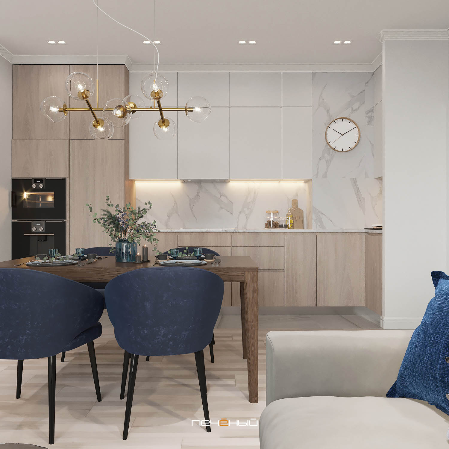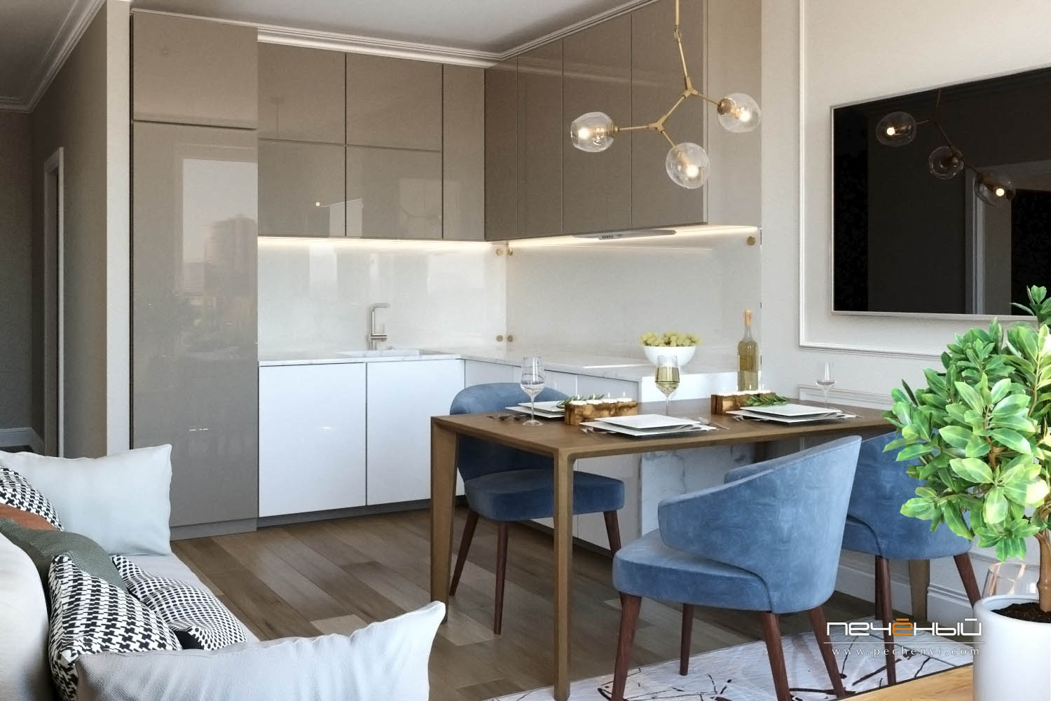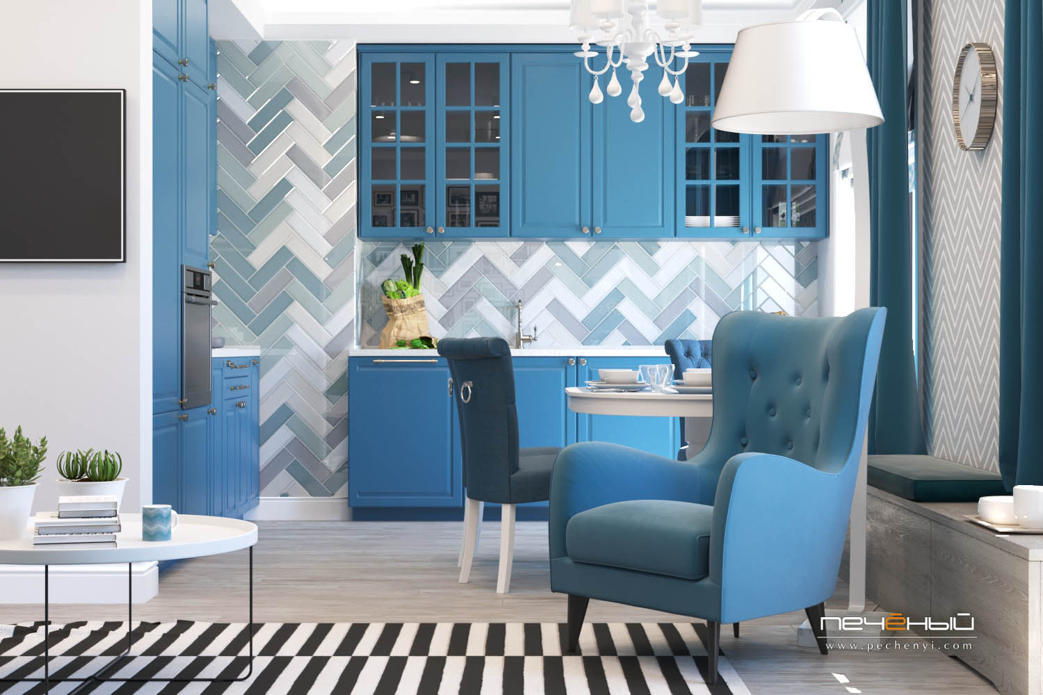 Нежный голубой оттенок всегда привносит в интерьер свежесть и лёгкость. Чтобы эта кухня-гостиная не смотрелась слишком прохладной, мы добавили серого цвета – так атмосфера стала уютнее.