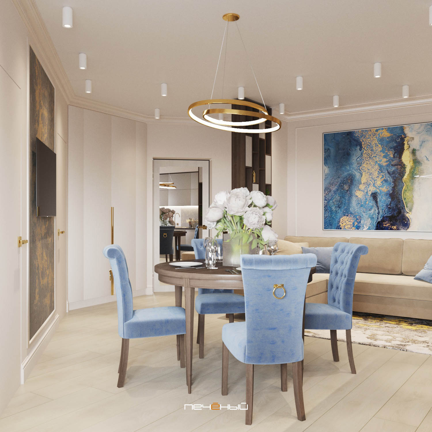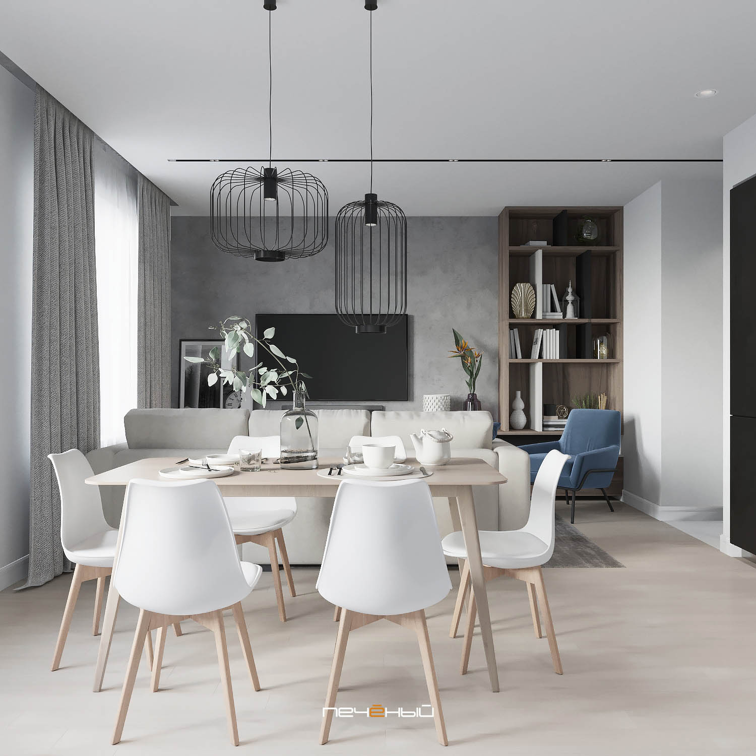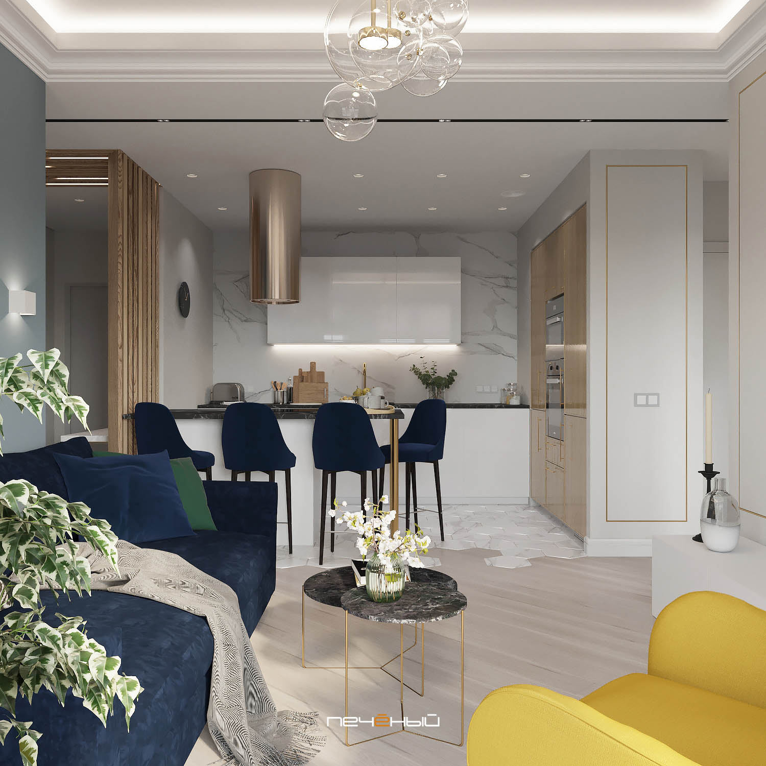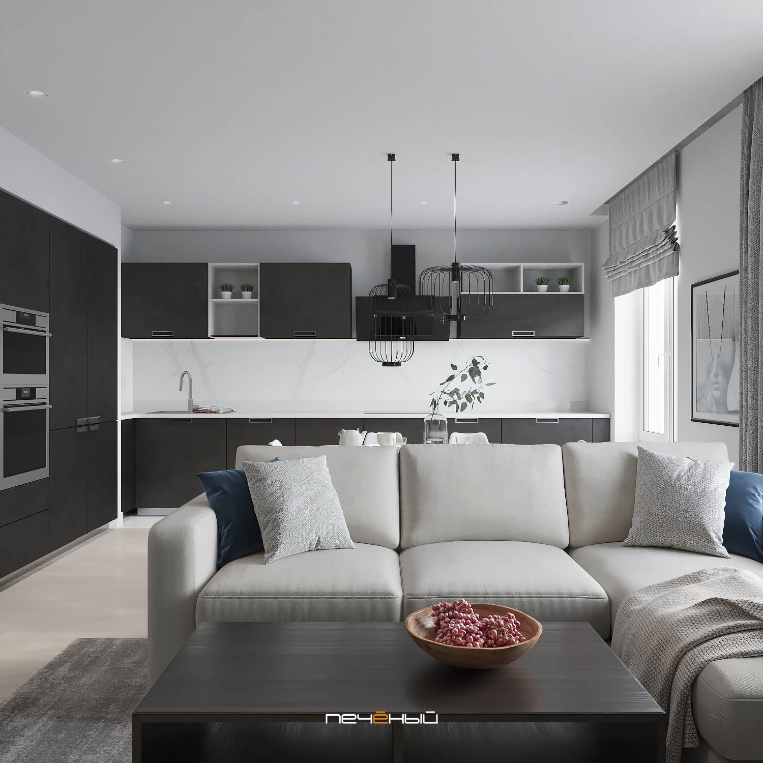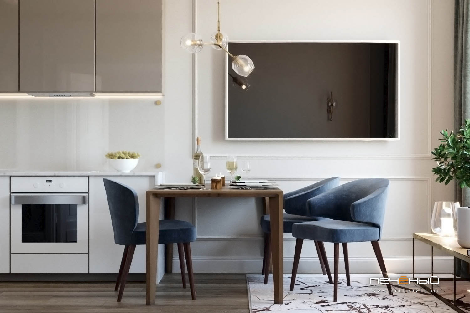 Нежный голубой оттенок всегда привносит в интерьер свежесть и лёгкость. Чтобы эта кухня-гостиная не смотрелась слишком прохладной, мы добавили серого цвета – так атмосфера стала уютнее.