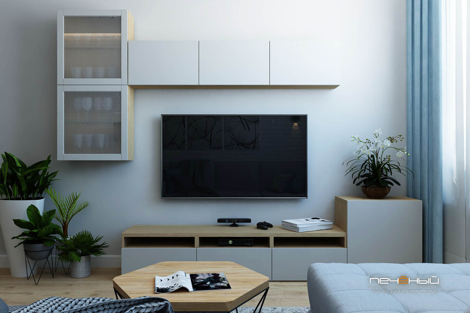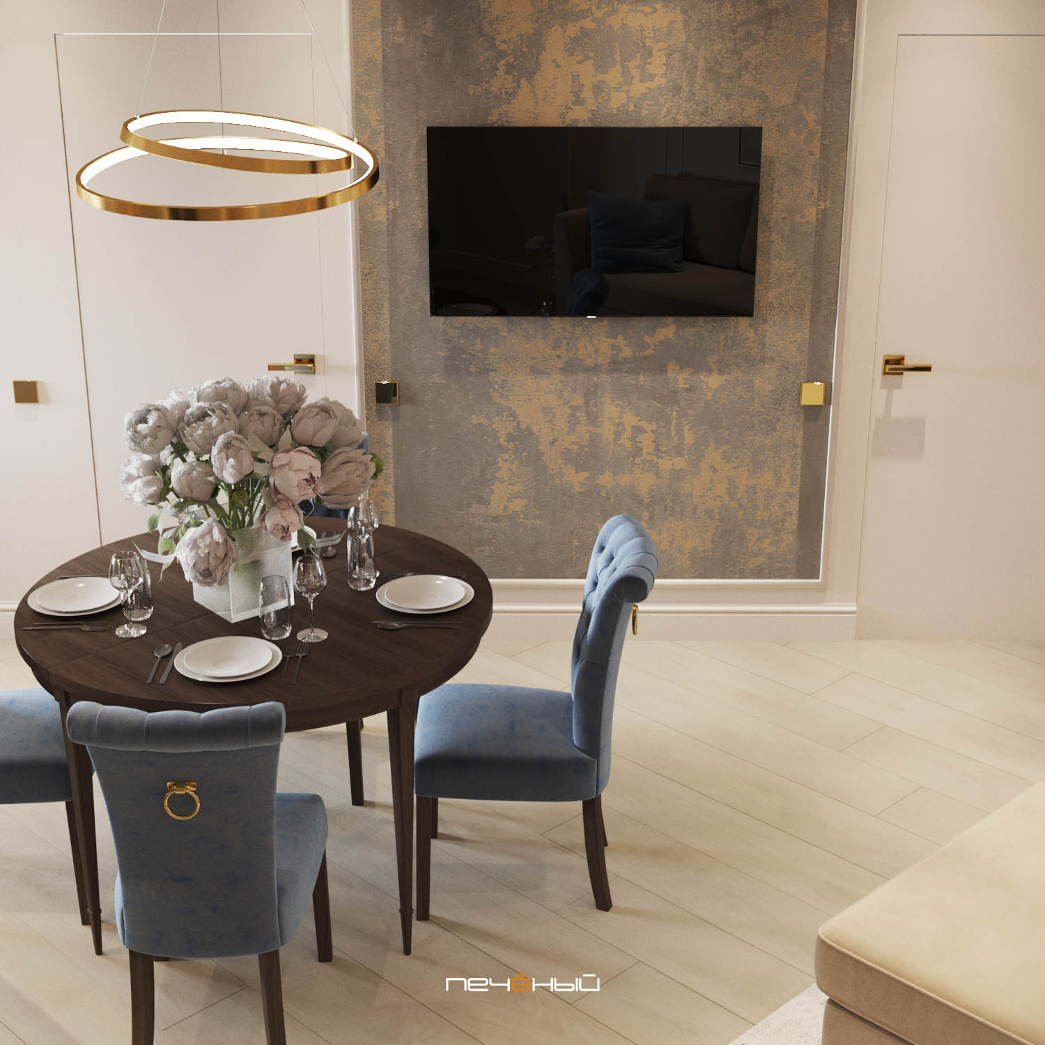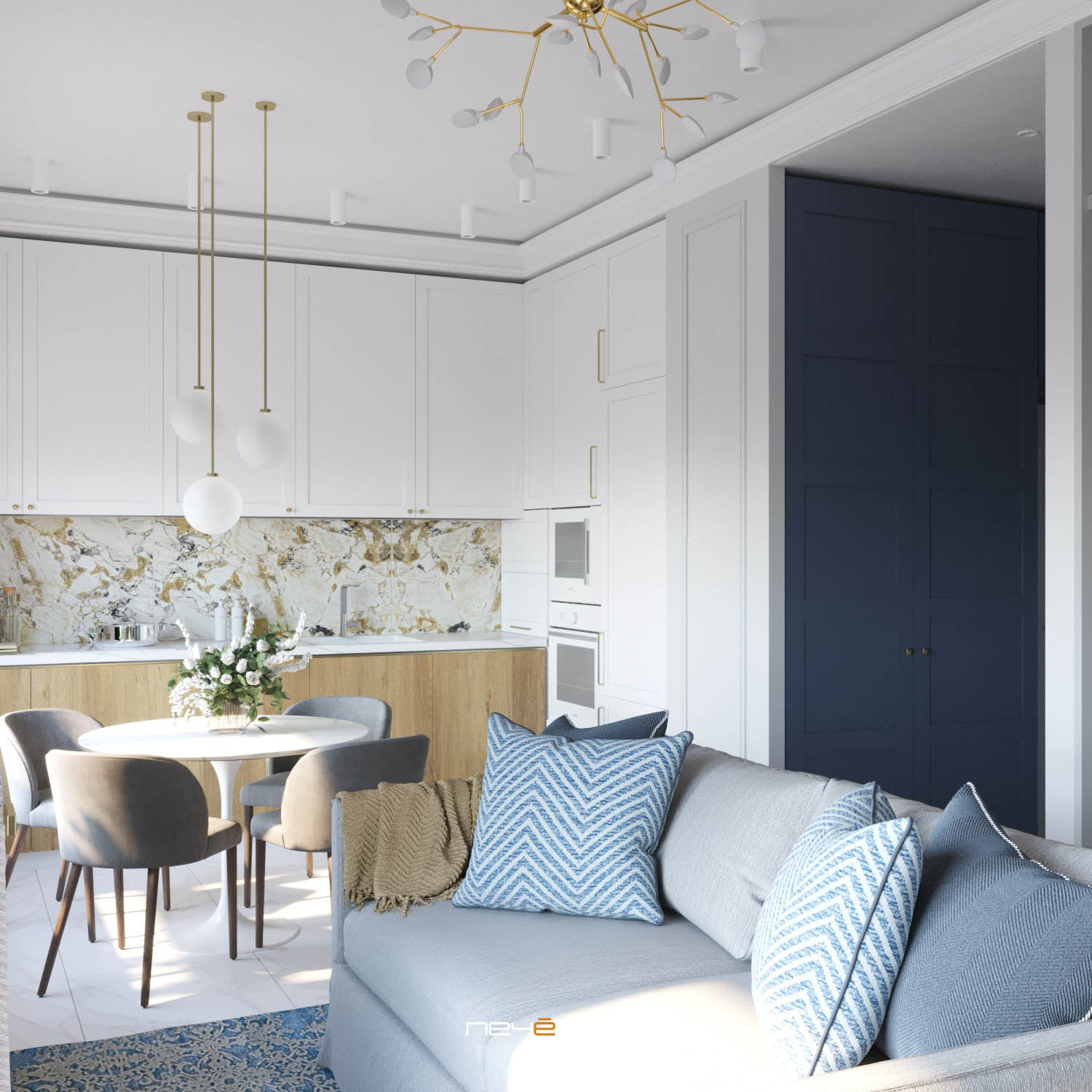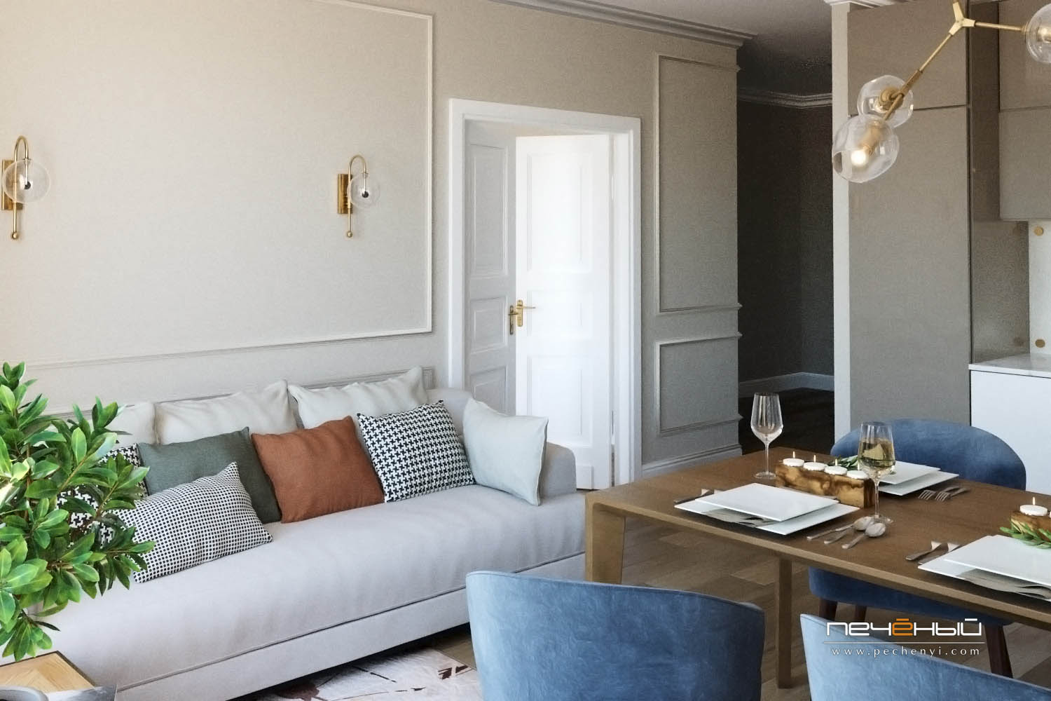 Нежный голубой оттенок всегда привносит в интерьер свежесть и лёгкость. Чтобы эта кухня-гостиная не смотрелась слишком прохладной, мы добавили серого цвета – так атмосфера стала уютнее.