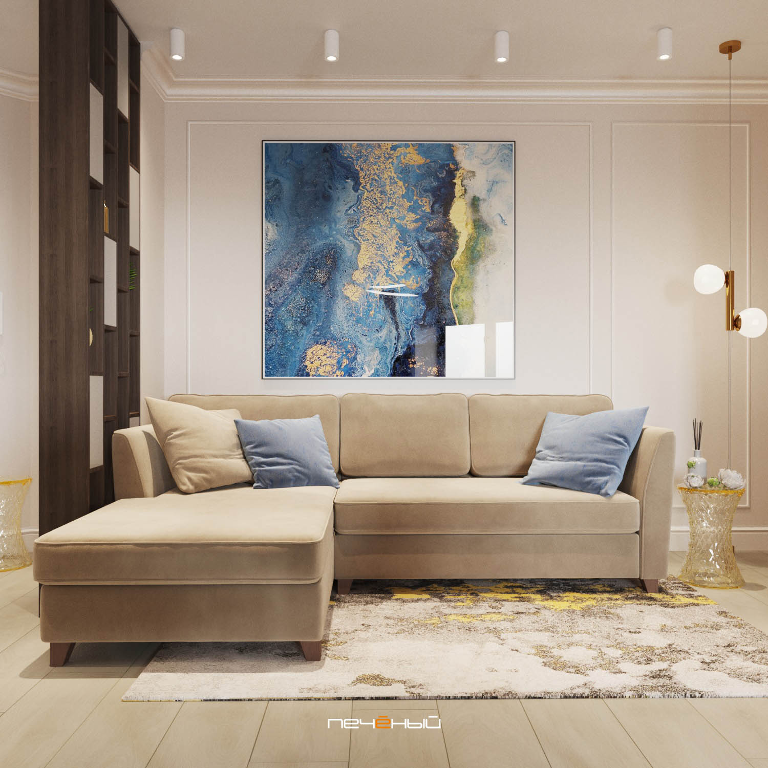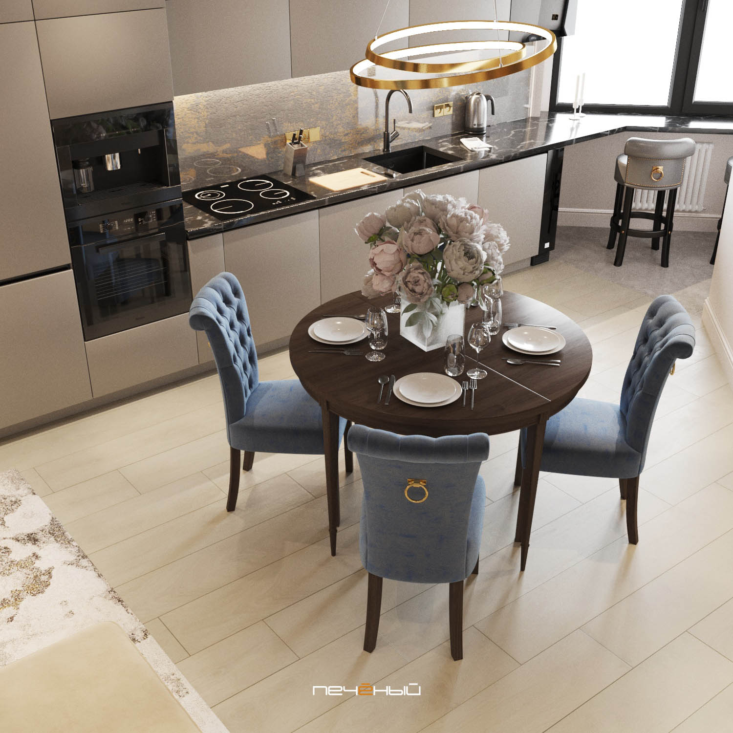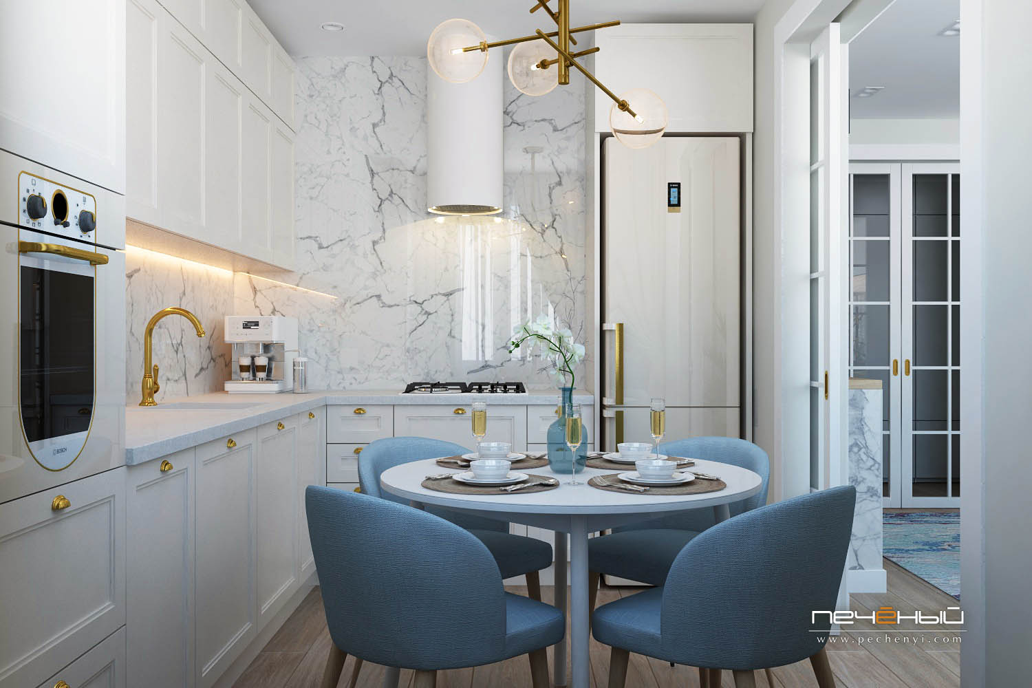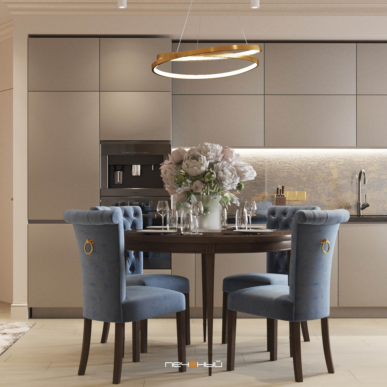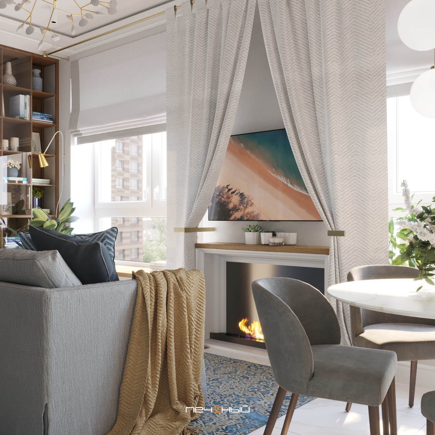 Нежный голубой оттенок всегда привносит в интерьер свежесть и лёгкость. Чтобы эта кухня-гостиная не смотрелась слишком прохладной, мы добавили серого цвета – так атмосфера стала уютнее.