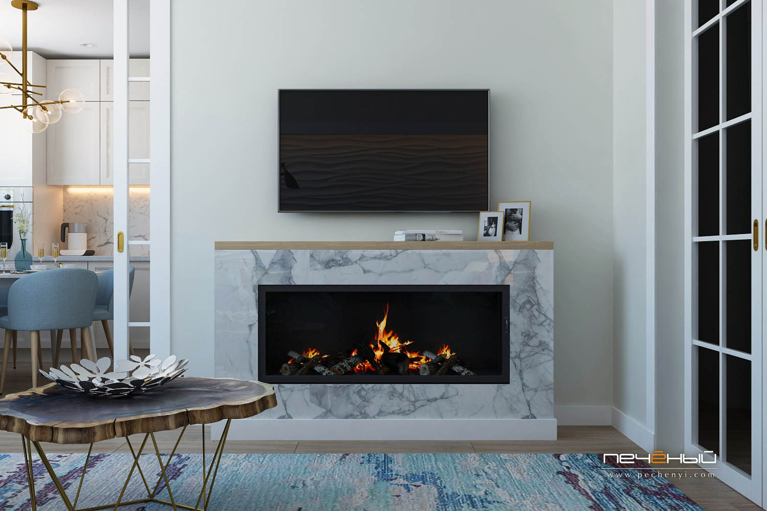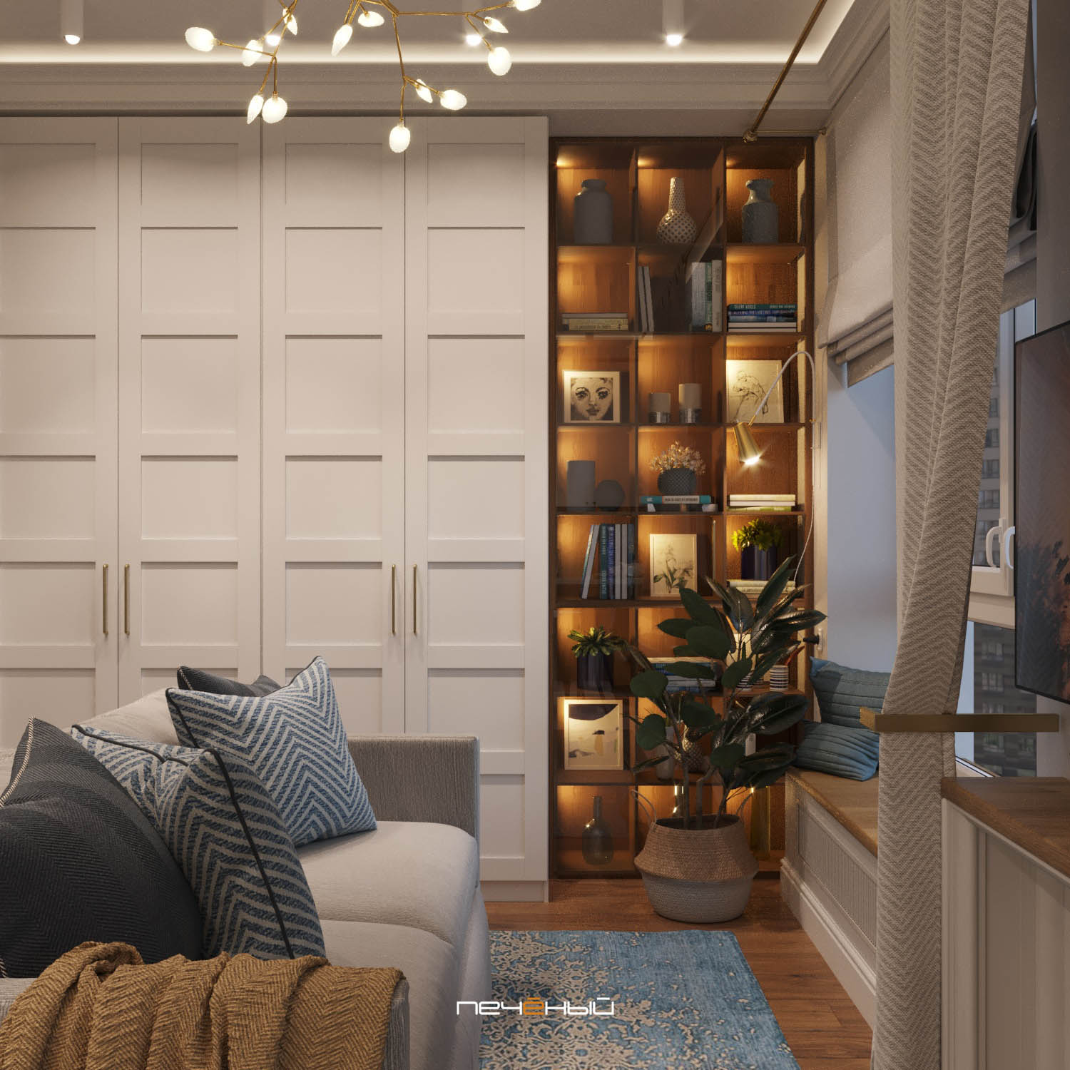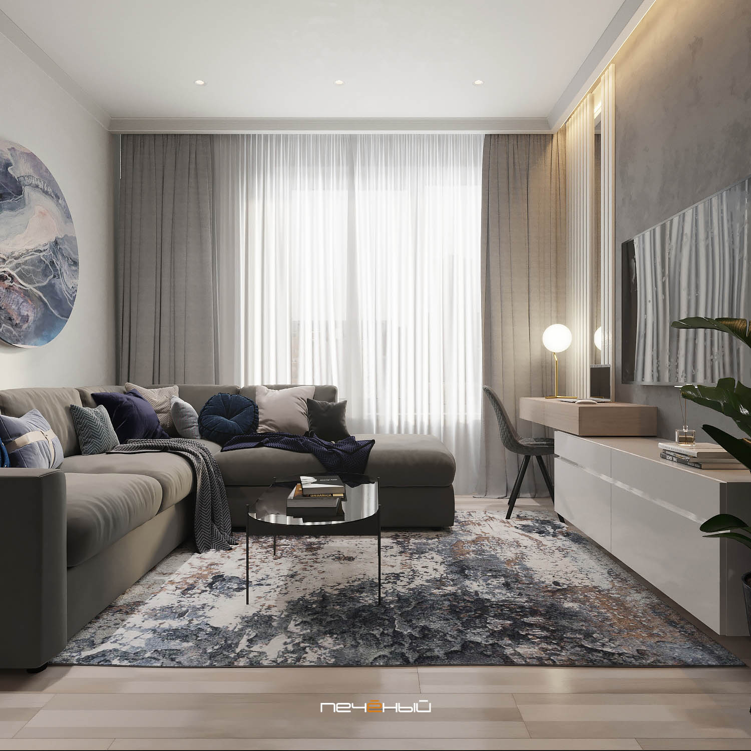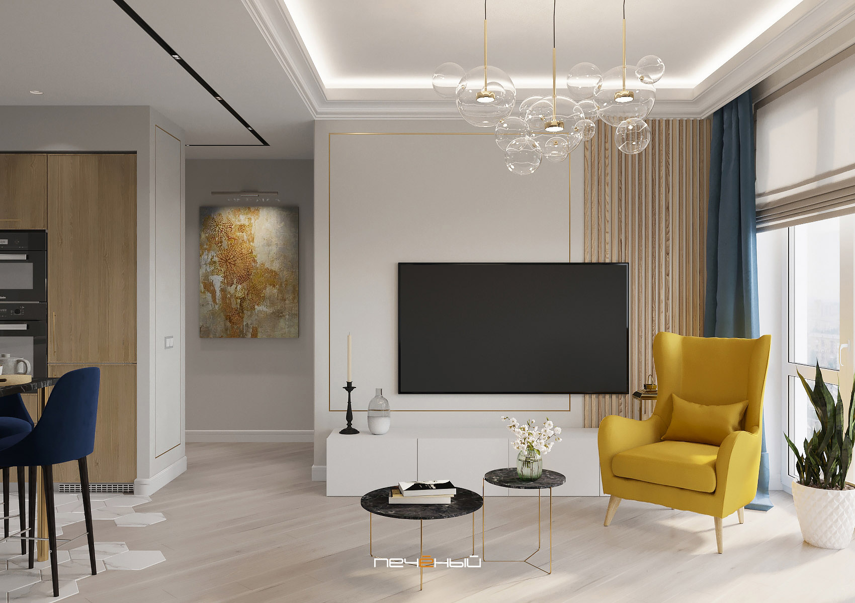 Нежный голубой оттенок всегда привносит в интерьер свежесть и лёгкость. Чтобы эта кухня-гостиная не смотрелась слишком прохладной, мы добавили серого цвета – так атмосфера стала уютнее.