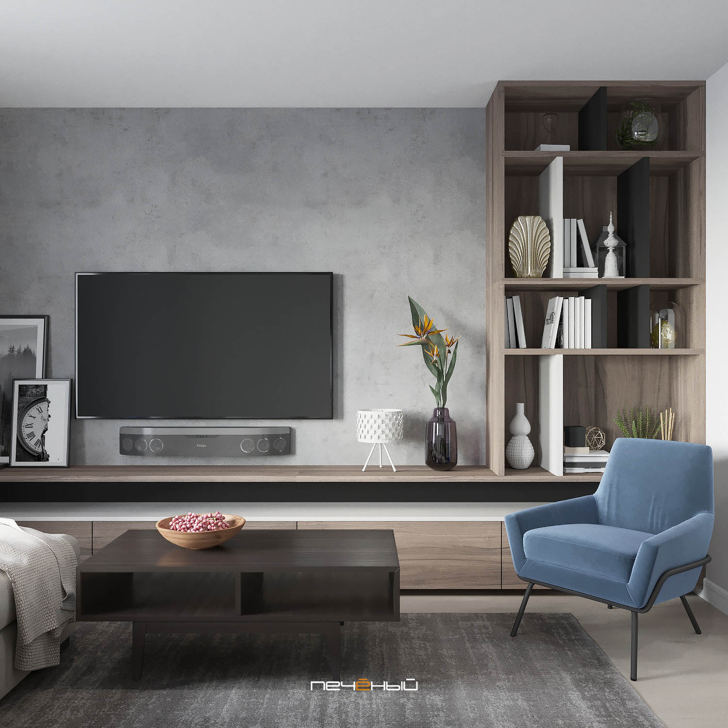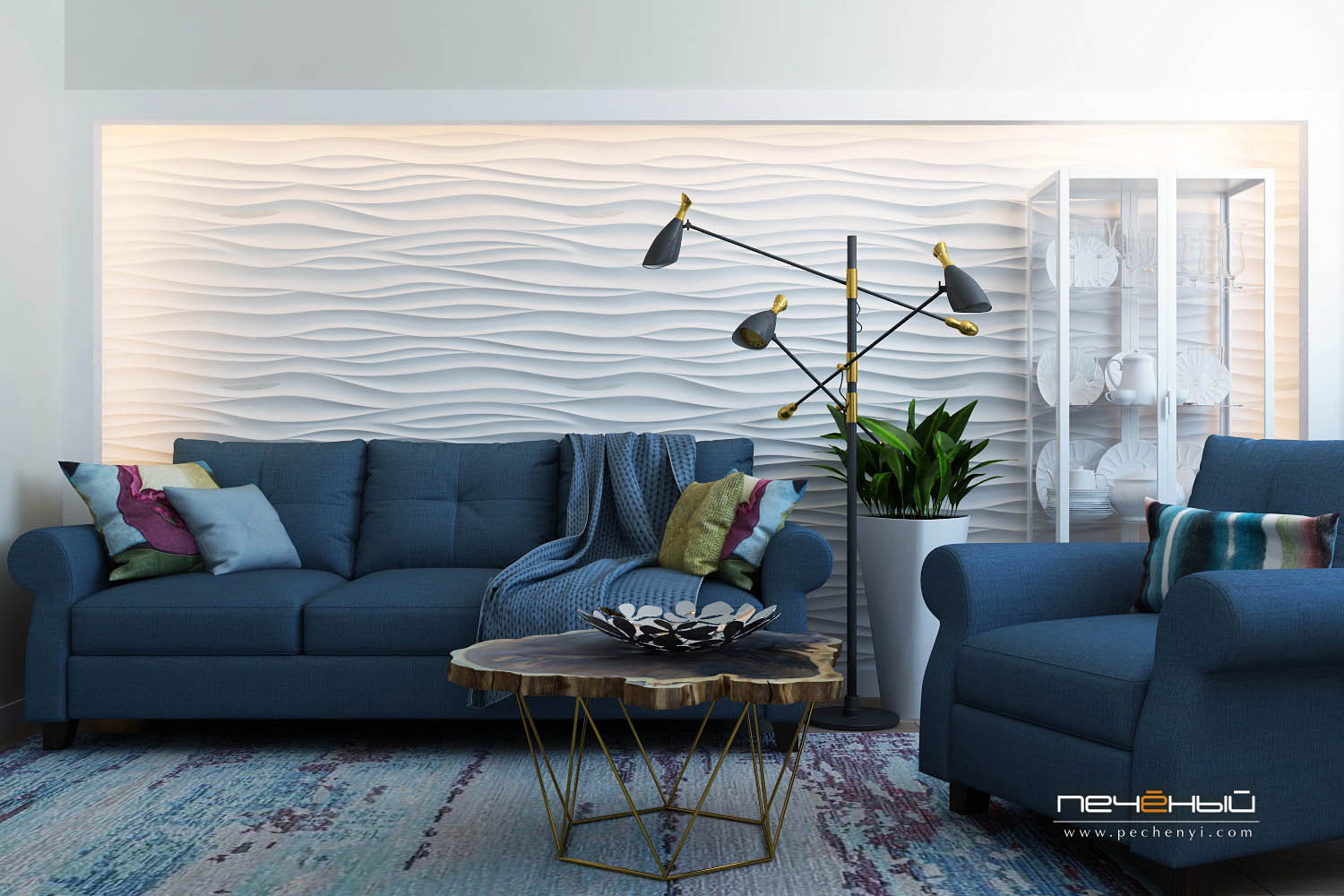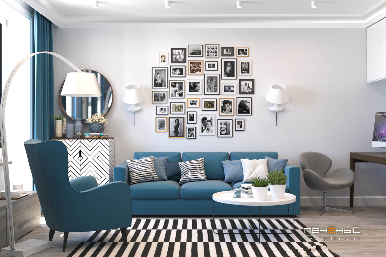 Очень динамичный и яркий серо-синий интерьер! На самом деле тут много дизайнерских фишек, но особенно хочется отметить геометрические линии – именно они создают ощущение бодрости и движения.