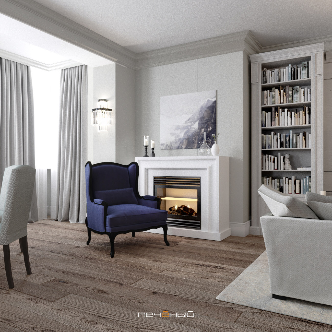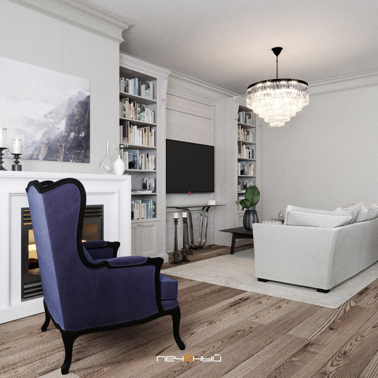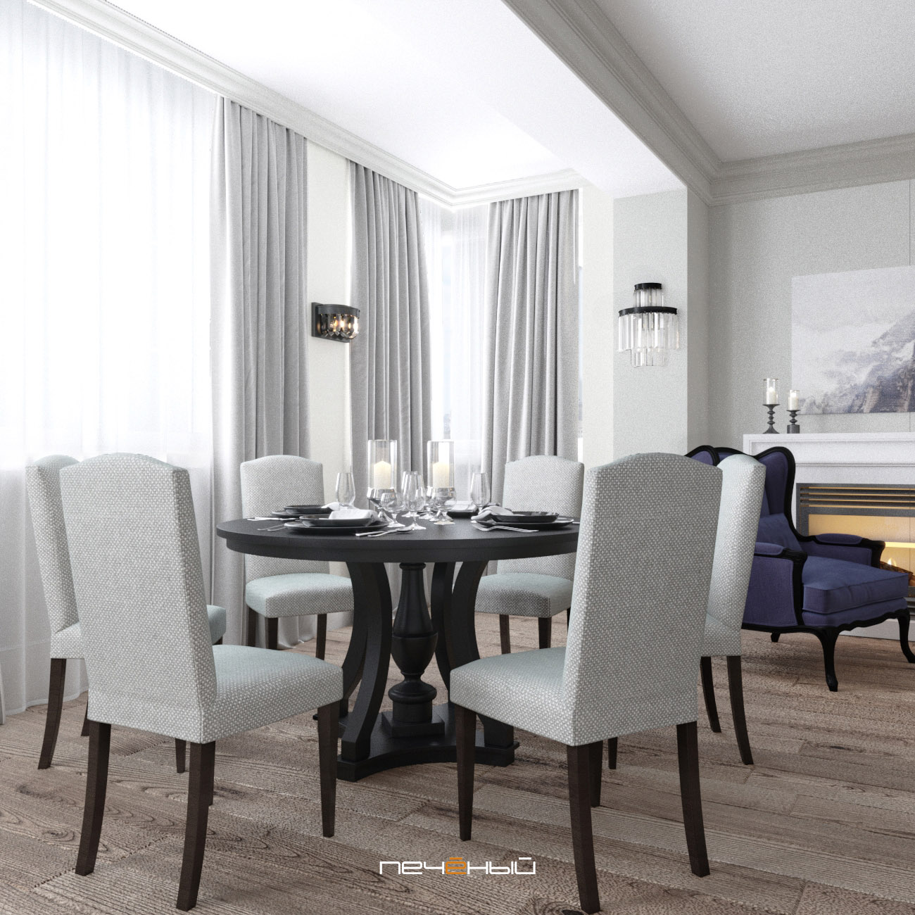 Надо отметить, что этот классический интерьер только выиграл от использования нежного жемчужно-серого тона стен – в белом варианте такой дизайн смотрелся бы куда проще.