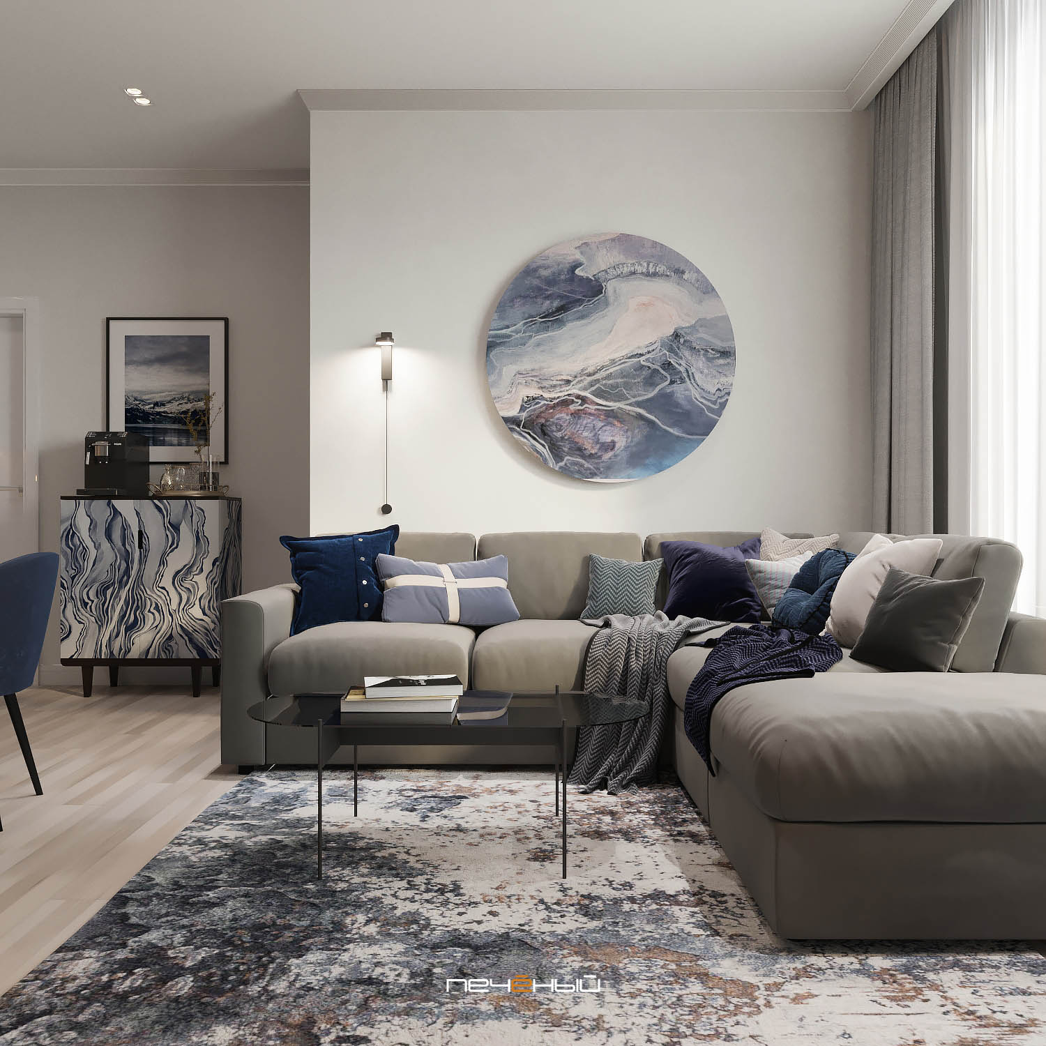 Насыщенный и глубокий синий цвет в этом современном интерьере является акцентным, а светло-серый, наравне с белым и бежевым, стали фоновыми оттенками. Уверен, что многие оценят этот полный достоинства интерьер!