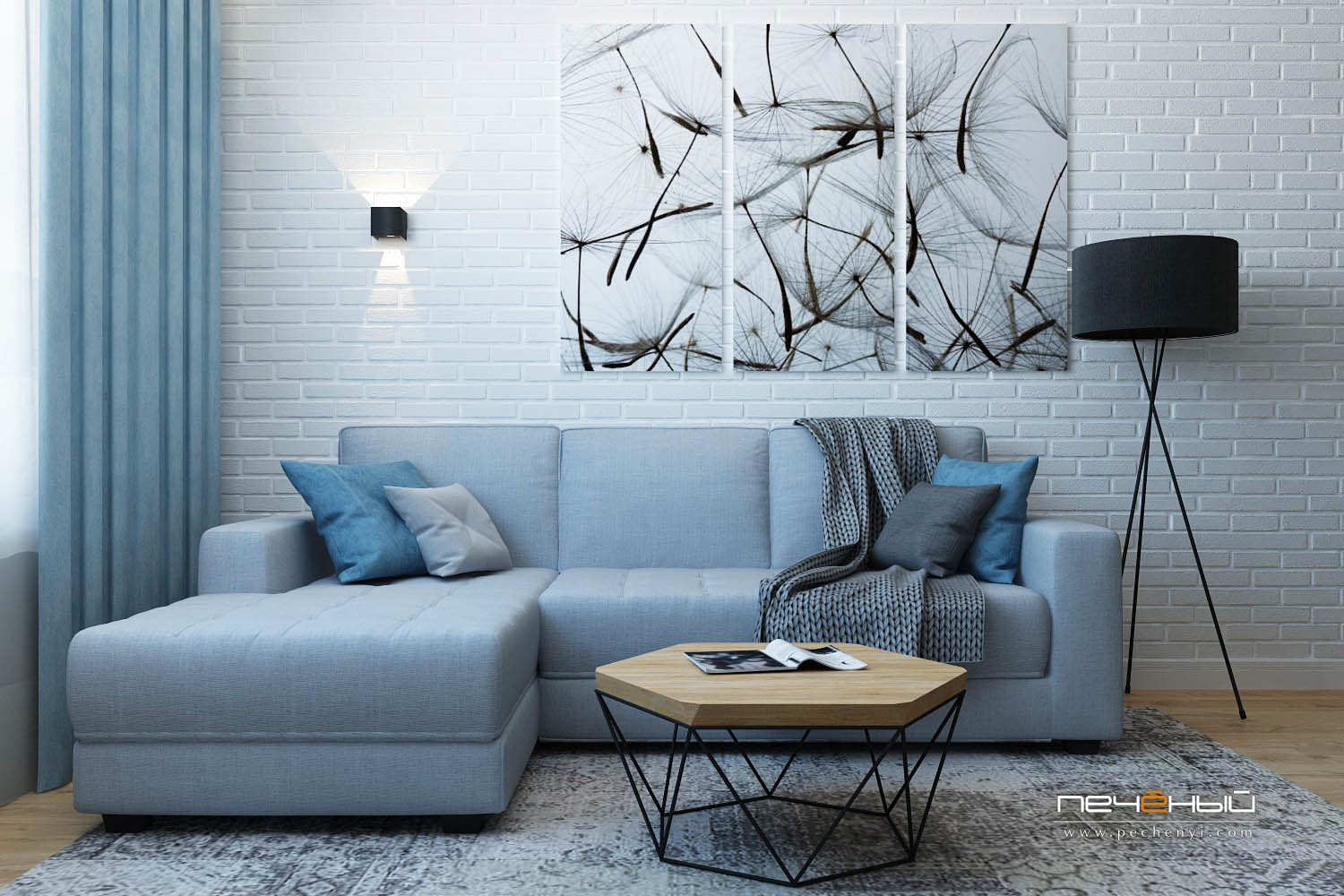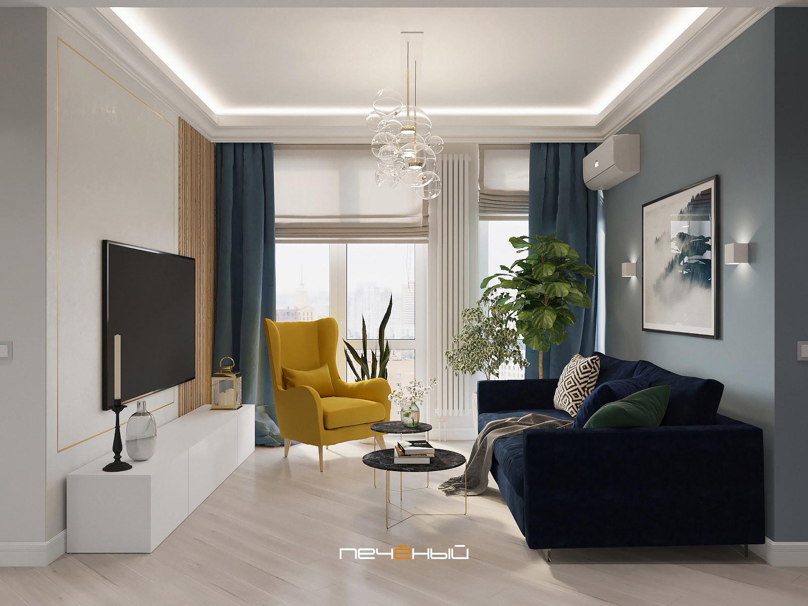 Гостиная. Палитра оттенков желтого и синего цветов очень широка. Однако здесь есть нюансы. Если окна гостиной выходят на солнечную сторону – уместно использование холодных оттенков. Если помещение трудно назвать хорошо освещенным, то более глубокий и теплый тон подойдет более всего.