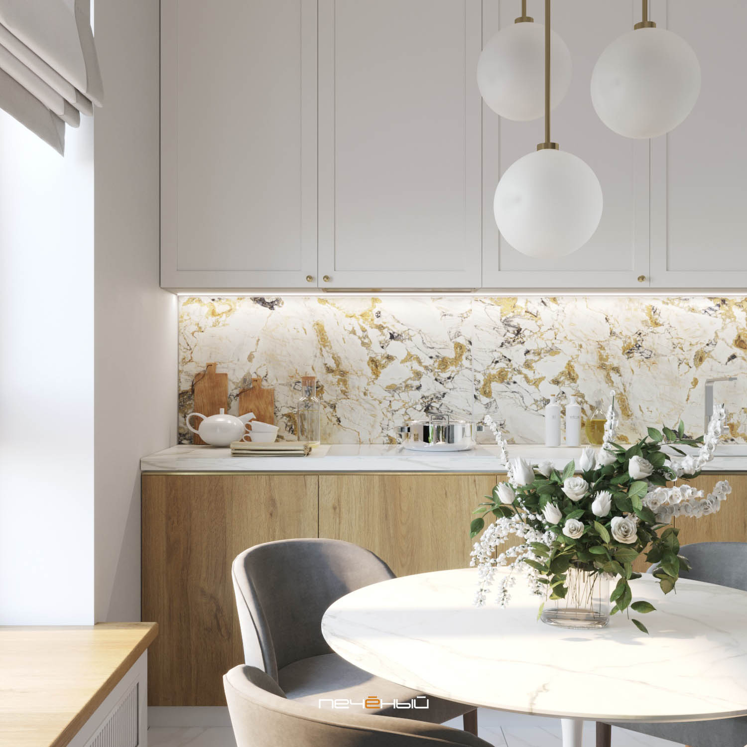 К слову, в таких небольших объединённых помещениях кухню хорошо делать в светлых тонах – так она и смотрится легче, и не притягивает к себе излишнее внимание