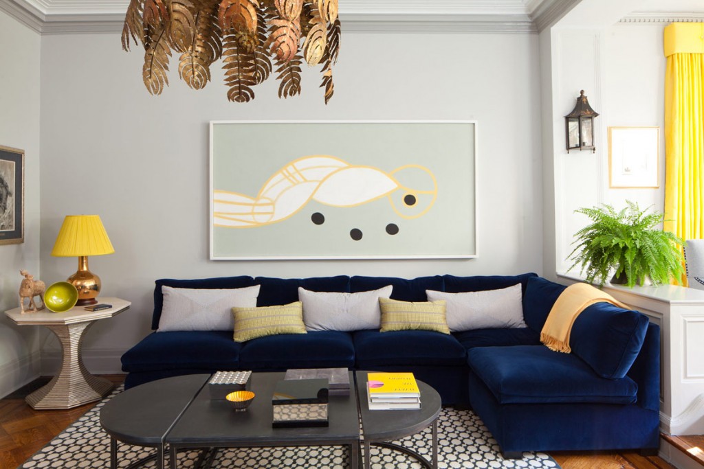Мягкая мебель синего цвета отлично уживается в ярком и эмоциональном интерьере