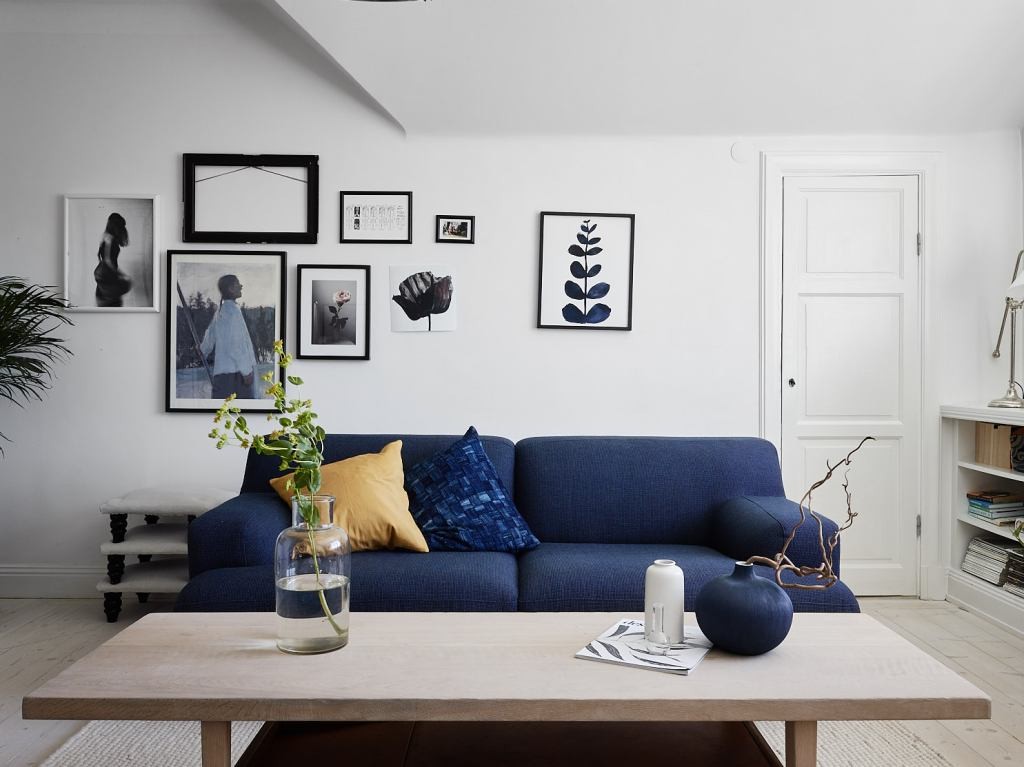 Говоря про интерьер гостиной с синим диваном, обычно подразумевают довольно насыщенный тон, хотя в палитру входит не только он: