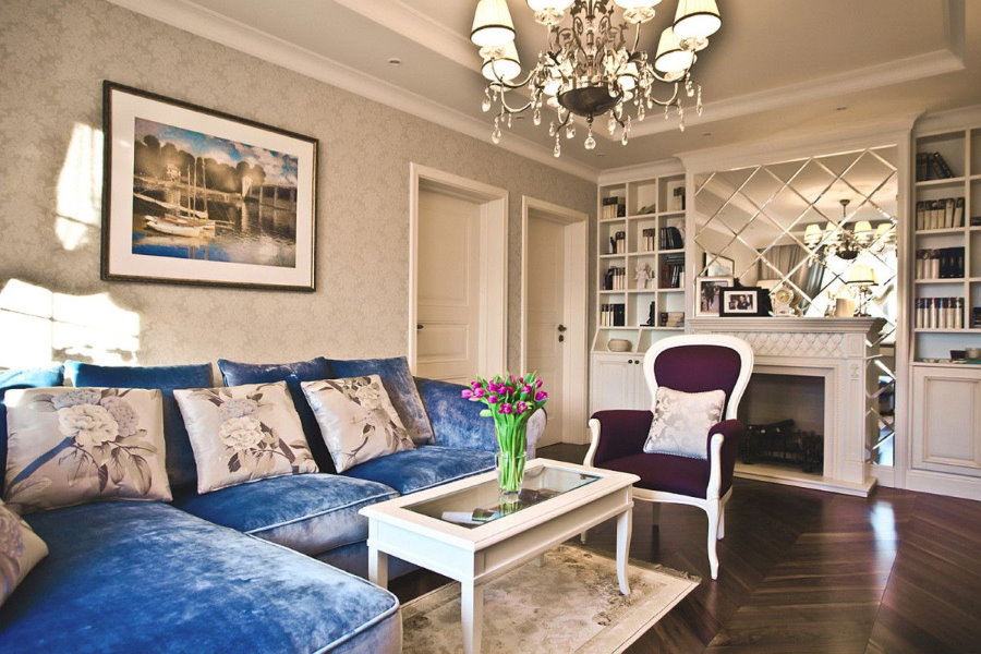 - для гостиного интерьера, синий не подходит как основной цвет, здесь он лучше проявляется в деталях, например, обивка дивана или занавеси;