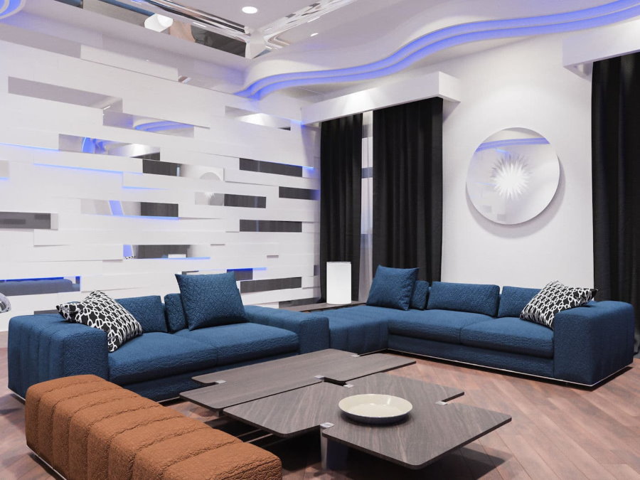 В интерьере гостиной, одинаково хорошо будут смотреться модели, как в пастельных и светлых синих тонах, так и изделия более насыщенного и глубокого оттенка. При выборе темной цветовой гаммы, следует позаботиться о качественном освещении в виде светильников, люстр или торшеров, которые могут иметь привычный бело-жетый свет.