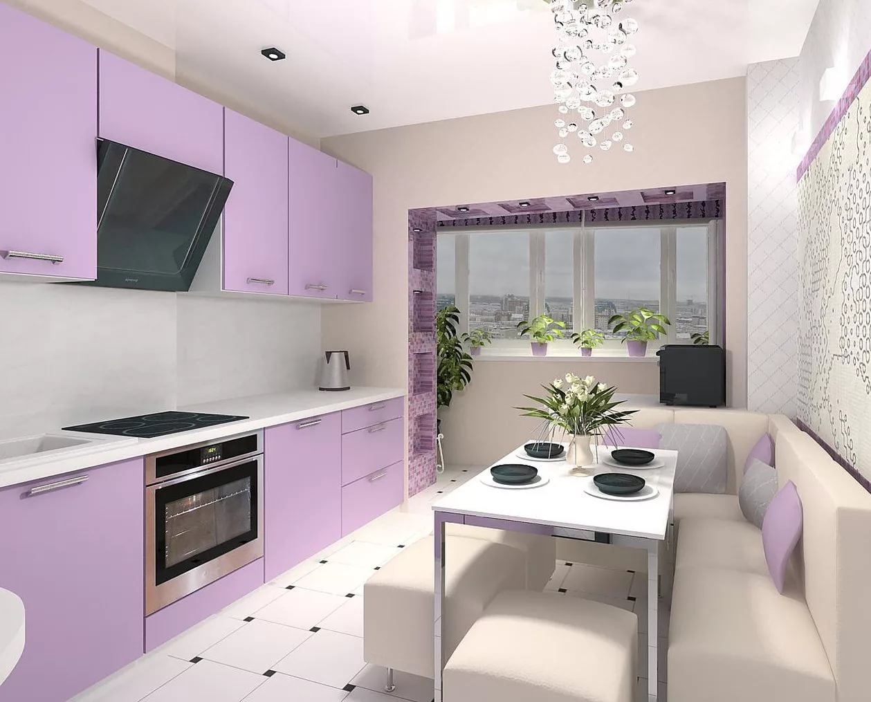 Для отделки стен можно применить моющиеся обои с нежным орнаментом, либо просто покрасить их. Обеденный стол и стулья могут быть бежевыми или желтыми. Кухонный гарнитур можно обустроить в светлых лиловых тонах, его дополнит серо-фиолетово-желтый фартук из керамической мозаики.